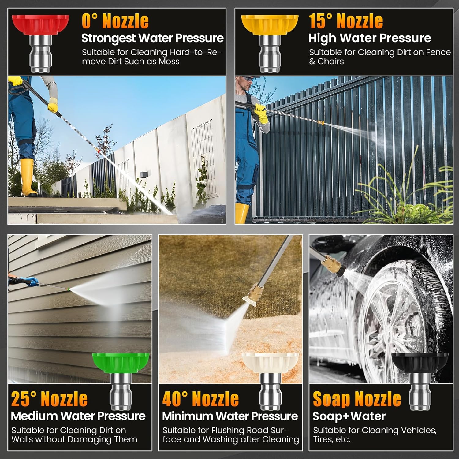 Versatile Cleaning Options: The pressure washer includes 5 quick-connect nozzles (0º,15º, 25º, 40º, 60º, and soap) to tackle different cleaning tasks, such as porches, driveways, patios, and even vehicles, providing flexibility for various cleaning needs.1L soap tank with adjustable switch-use to spray soaps and detergents.