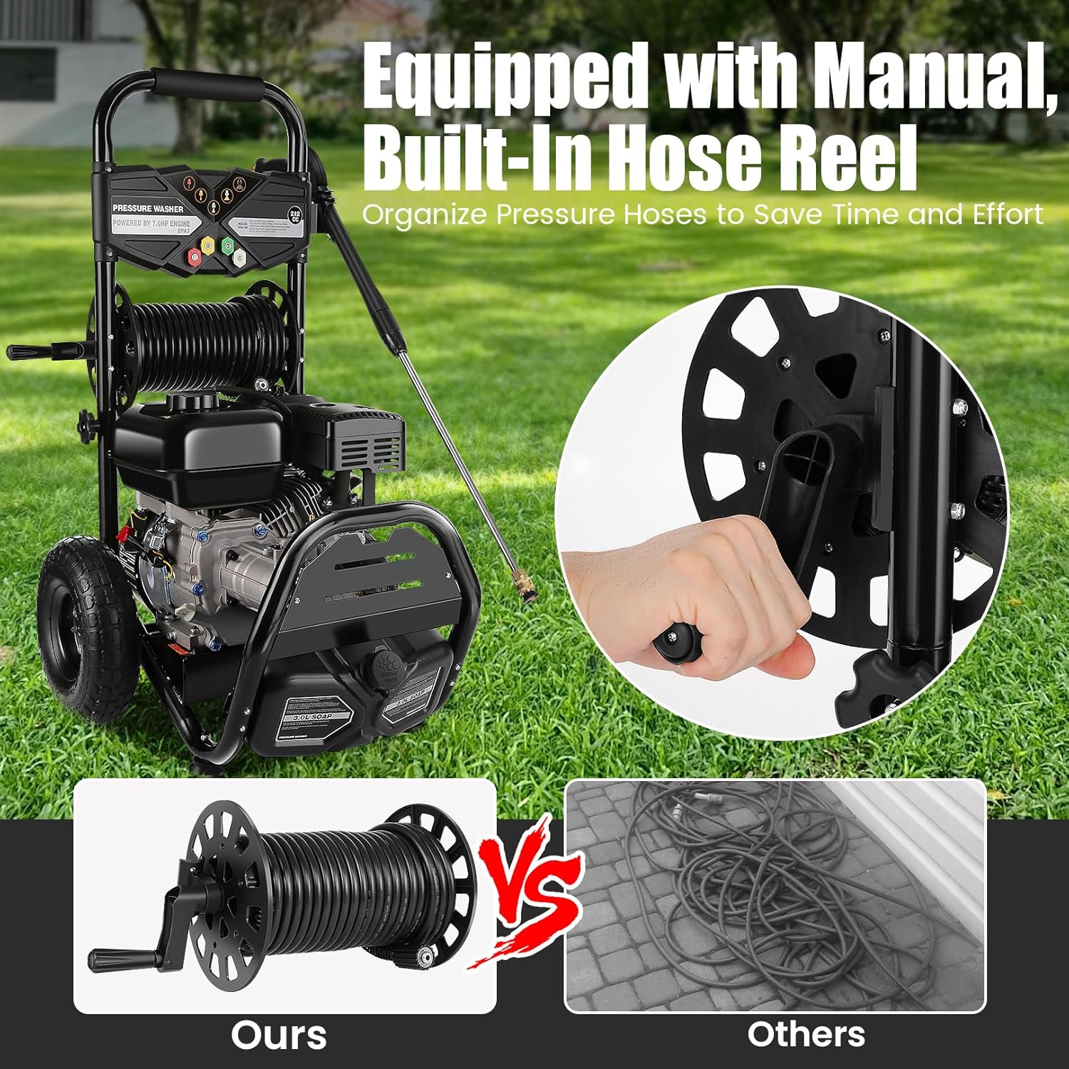 Efficient Gasoline Engine:This gas pressure washer is powered by a rugged 7HP 4-stroke 212cc gasoline engine and recoil start system,it is paired with a durable axial cam pump,which is highly reliable and designed for heavy workloads,not only powerful,but also easy to start and with minimal maintenance costs,ensuring years of continuous operation,and factory integrity testing to ensure reliable performance.CARB compliant.Cleaning power is 100% higher than electric pressure washer.