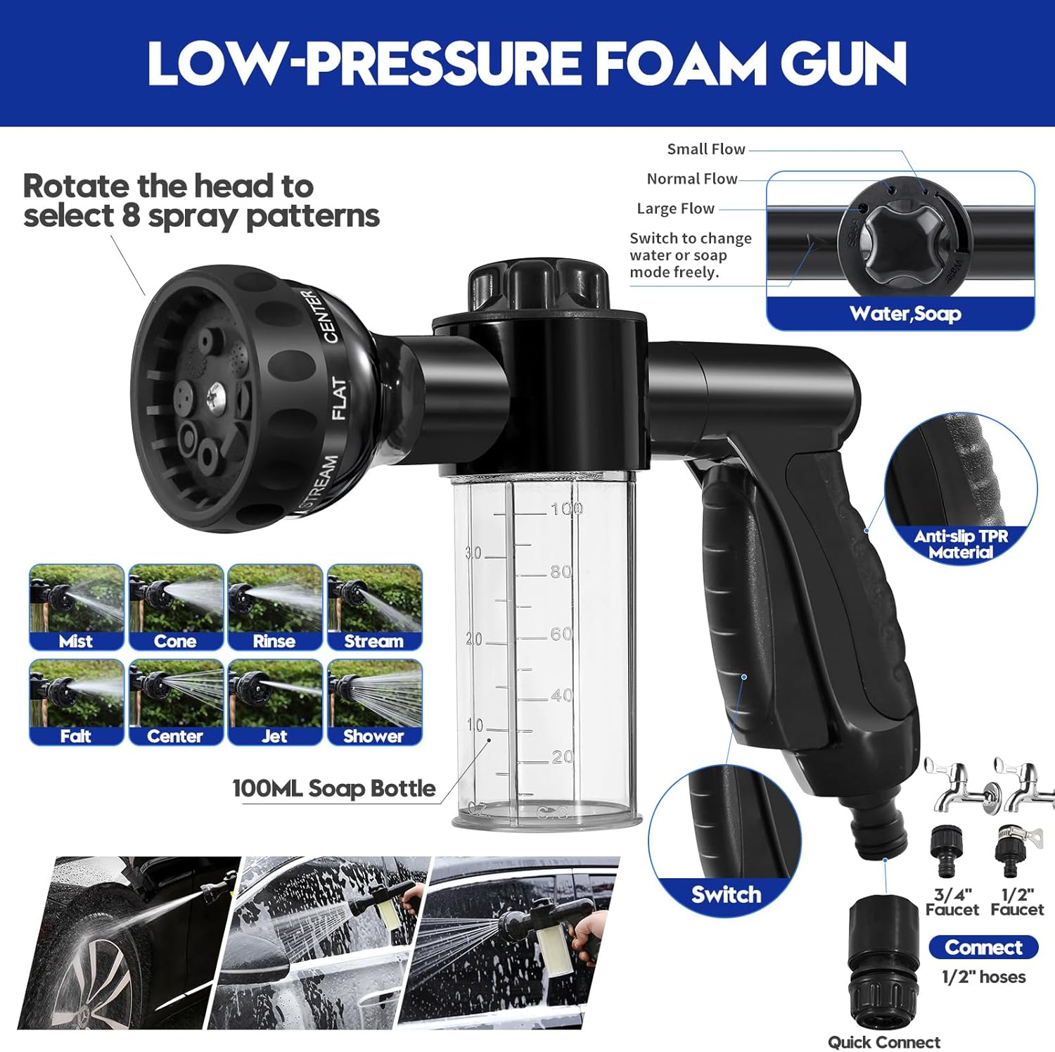 Car Wash Foam Gun & Bucket & Windshield Cleaner Kit: The low-pressure foam gun with 8 spray patterns and 3 quick connectors to connect 1/2″ hoses makes car wash effeicently. The portable 11L collapsible bucket is ideal for car washing at any time any place. Windshield cleaner tool helps to remove the fog, moisture or dirt on car window. Towels and wash mitt are soft and safe to wash on delicate surfaces. Please make sure that the towels have been washed before starting to use them