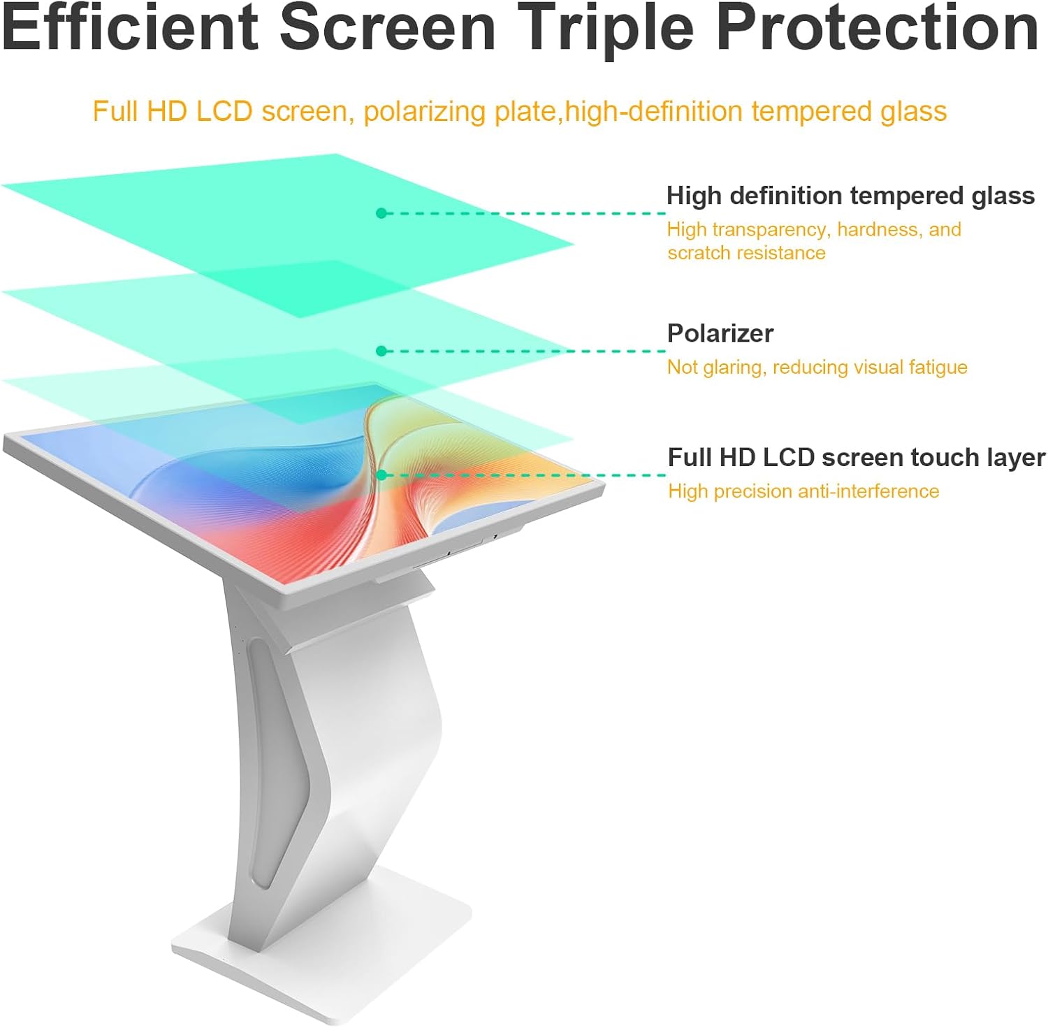 [Large 32″ Interactive Display – Smooth Multi-Touch Experience] The 32 inch interactive touch screen display features responsive multi-touch technology and a vivid Full HD screen. Customers can easily browse menus, search products, check mall navigation, or interact with digital advertisements in restaurants, shopping malls, and retail environments.