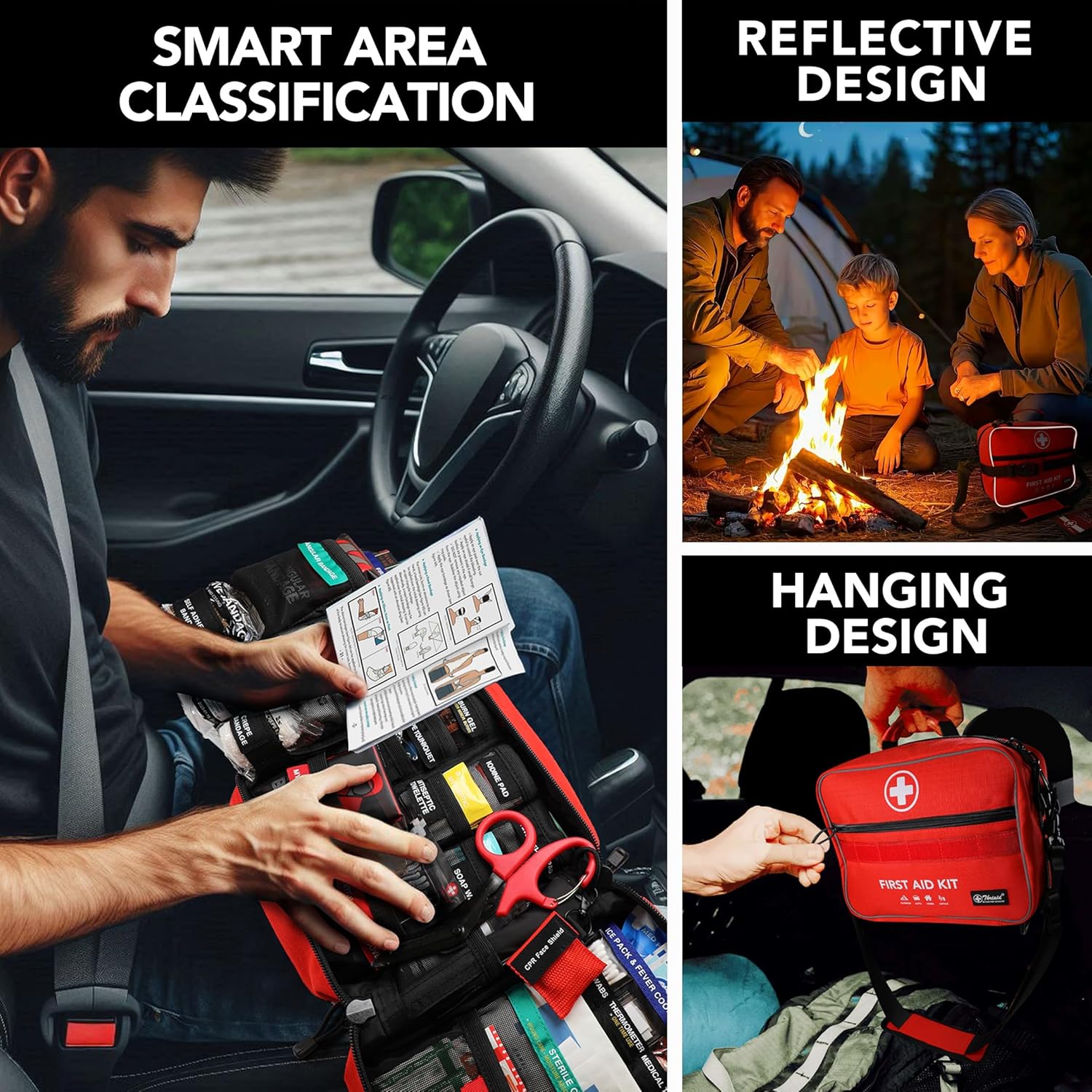 BORN FOR FIRST AID ▶ Equipped with reflective strips on both sides to reflect light in the dark. The handles on the top, comfortable shoulder straps on both sides and MOLLE system greatly increase portability. Just hang it on backpack, car seat, bicycle or place it in any space. Ideal for home, outdoor, travel, vehicles, offices, etc.