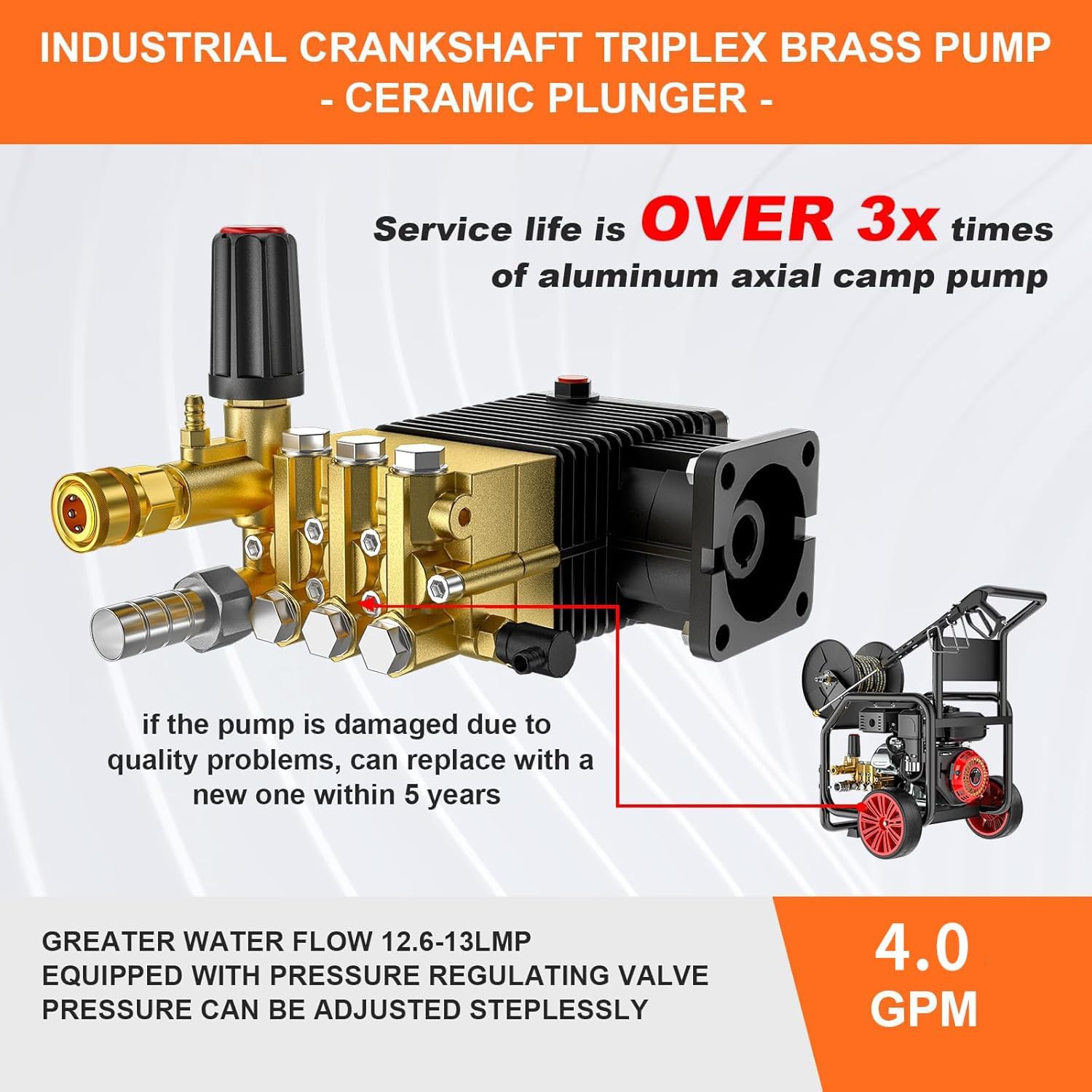 HEAVY-DUTY ENGINE: Features a 420cc 4-stroke commowner OHV horizontal shaft engine with recoil start and a long-life, maintenance-free axial cam pump that delivers 4.0 GPM for water, providing reliable power for demanding jobs.