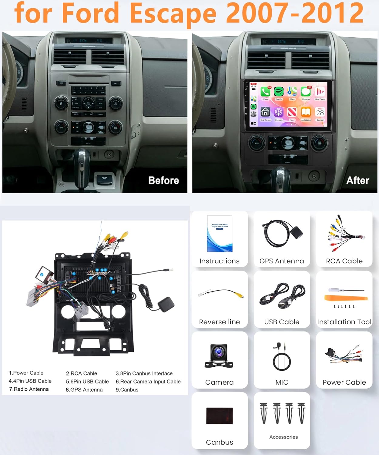 Android Touchscreen Stereo for Ford Escape: Compatible Vehicles: for Ford Escape 2007-2012/Ford Kuga 2007-2012/Mazda Tribu 2007-2012. 9” 2.5D Tempered Glass Mirror auto radio player. RAM 2G + ROM 64G memory, High definition 1080P, full capacitance touch screen for easy operation, well designed user interface for car only. Support split screen.