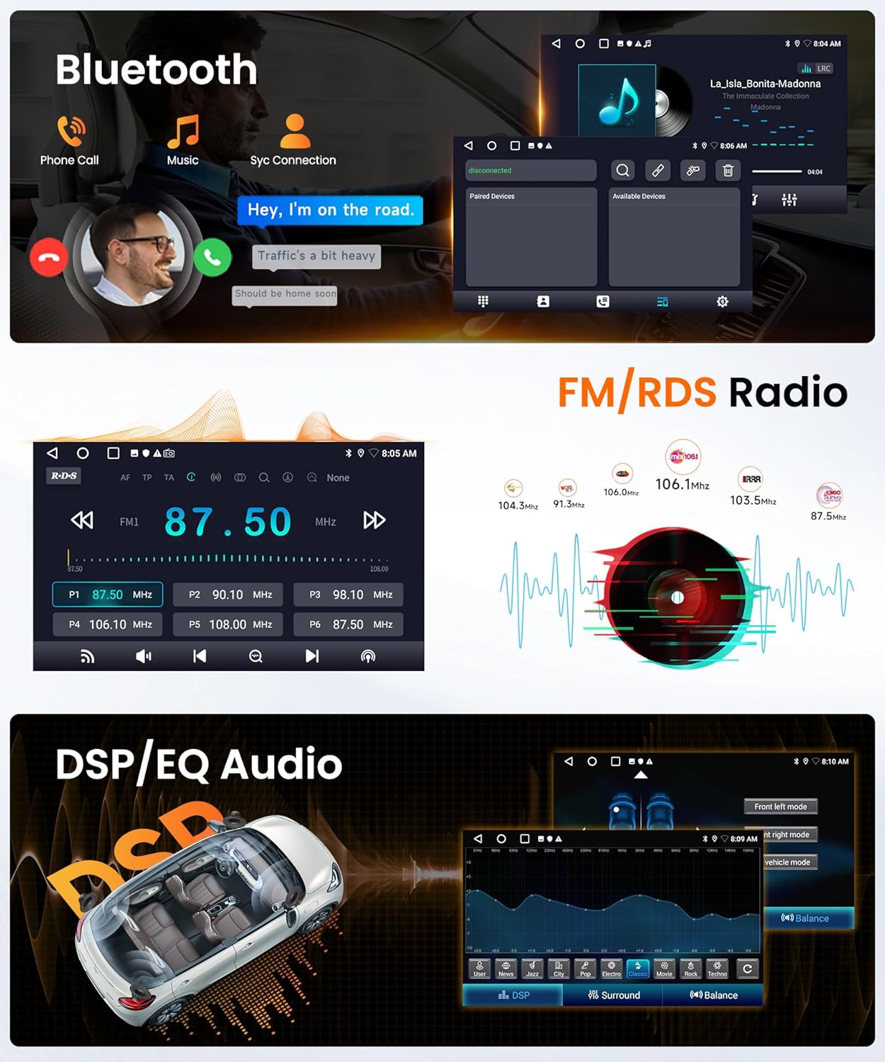 Bluetooth & FM Radio & EQ: for 2010 Ford Escape radio with bluetooth, connect to your phone via Bluetooth for hands-free answering and making calls, playing music intelligently. for 2007 Ford Escape radio with FM radio, 18 preset stations, you can listen to real-time traffic, news broadcasts, weather forecasts etc.Support a variety of EQ sound effects scene selection, Frequency division adjustment shocking surround panoramic.