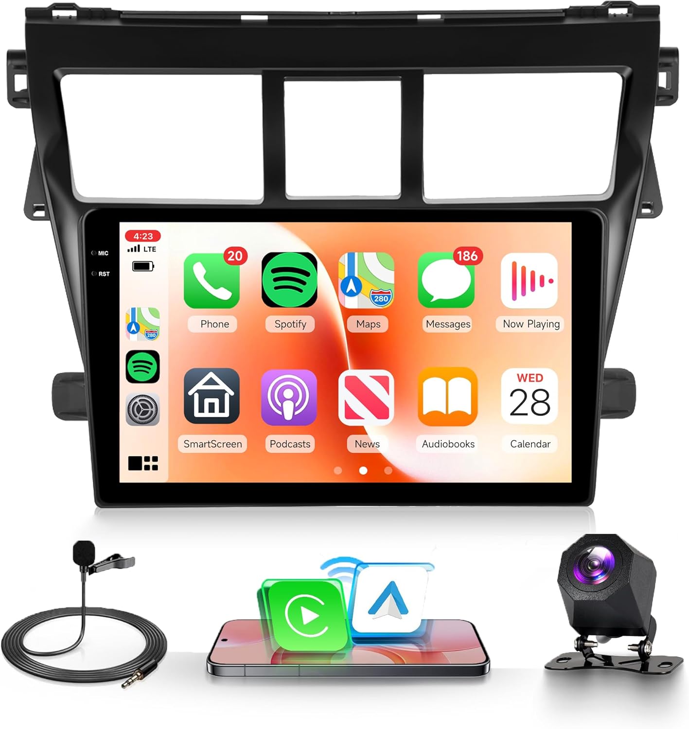 【Android Car Radio for Toyota Yaris 】Android car stereo carplay Fit for Toyota Yaris Vios 2007 2008 2009 2010 2011 2012 2013. Carplay stereo equipped with 2GB RAM + 64GB ROM, 9 inch Touch screen, enjoy HD colorful pictures. Support GPS/WiFi, 2 Spilt Screen, colorful UI, 2 USB adapter input etc.