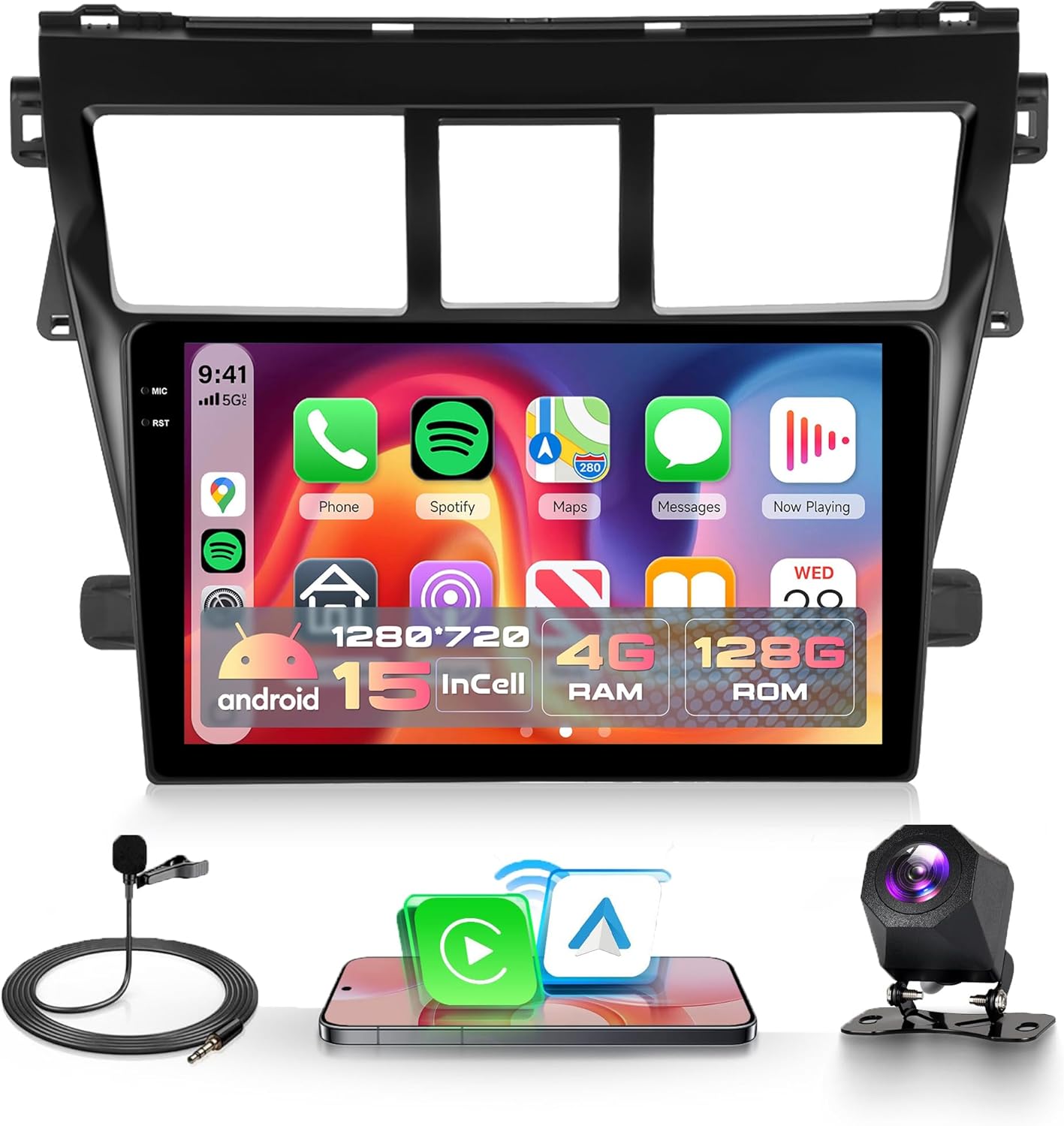 Compatible Vehicles: Car Radio Car stereo for Toyota Yaris VIOS 2007-2013, car stereo equipped with Android 15 system, 4 Core CPU, Memory:4GB (RAM)+128GB (ROM) with powerful and stable processing and storage, with no lag or delay.