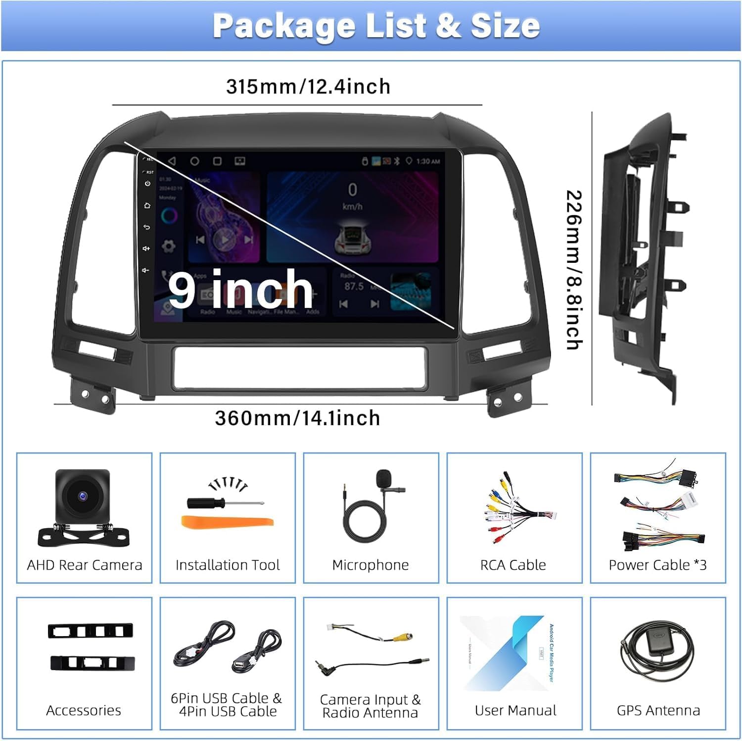 【Bluetooth 5.1, FM/RDS Radio】 For Santa Fe carplay radio with built-in Bluetooth 5.1 ensures seamless connections, expanded range, improved signal strength, and faster transmission for smooth hands-free calling and music streaming. FM/RDS radio with 18 preset stations and a wide range of channels (FM 87.50-108.0 MH) for access to new broadcasts, real-time traffic updates, and weather forecasts on the go.