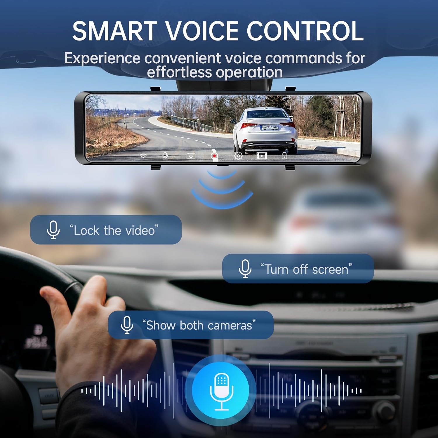 4K Rear View Mirror Camera, 12” Mirror Dash Cam, 4K/2.5K Backup Camera for Car, WiFi/GPS Dash Cam Front and Rear with 32GB Card, APP, Voice Control, WDR Night Vision, Reverse Assist (Black)