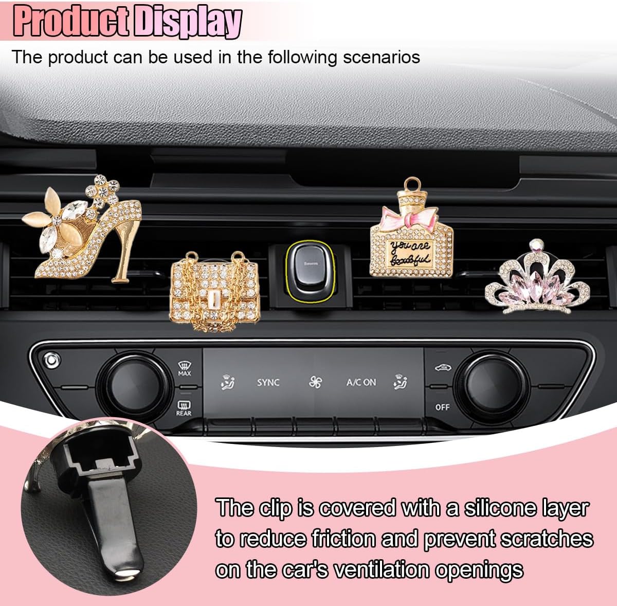 【Elegant Vent Trim】: The appearance of these car vent clips are designed in the shape of high heels, purses, crowns, and perfume bottles, inlaid with sparkling rhinestones, which are not easy to come off and glitter under the light, which can add a sense of magnificence and a lively and playful atmosphere to the car.