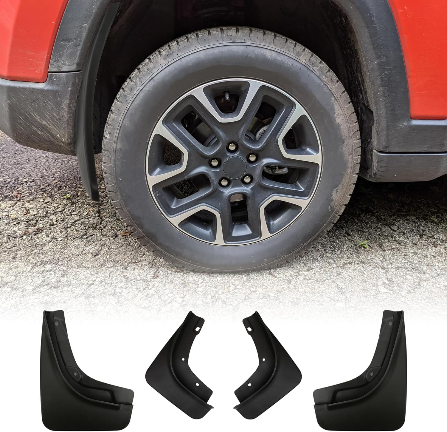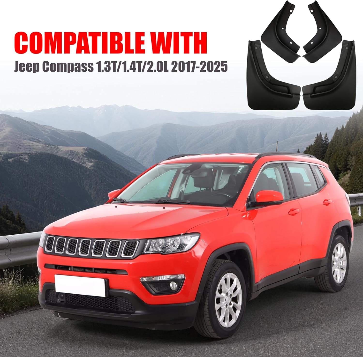 Vehicle Compatibility: Fit for Jeep Compass 1.3T / 1.4T / 2.0L, model years 2017, 2018, 2019, 2020, 2021, 2022, 2023, 2024, and 2025Material: High-quality automotive-grade plasticColor: BlackPackage Includes: 4 mud flaps (front and rear)