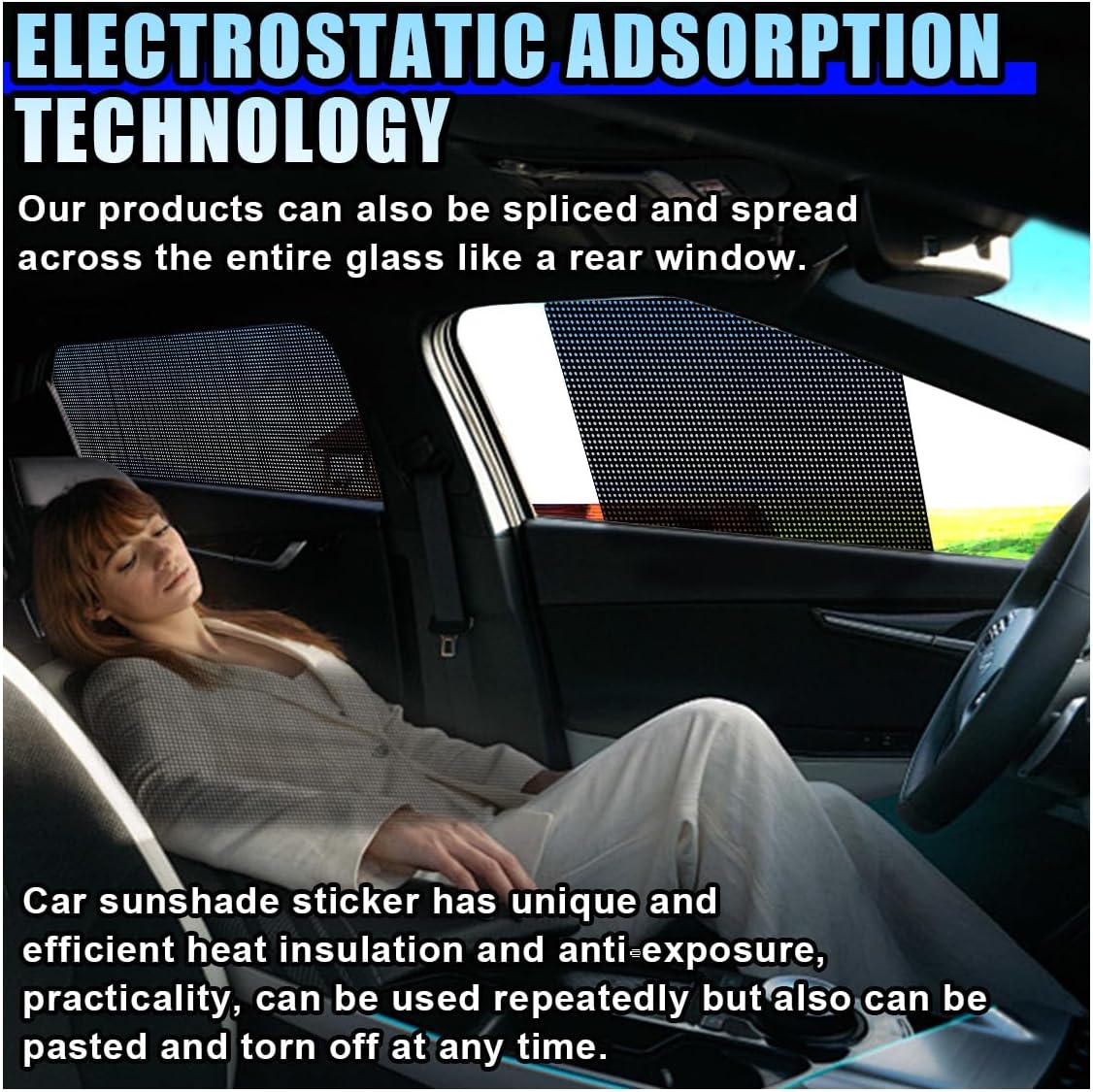【Versatile Applications】: The automotive window sunshade’s flexible nature allows it to be applied to most vehicles. You can splice and cut it according to the size and shape of the car window to achieve the best sun protection effect. Its thin and light design ensures that it won’t affect the up-and-down movement of the window after installation. Moreover, the removable car window film can also be used on the windows of homes, offices, and other places, which is highly practical and convenient.