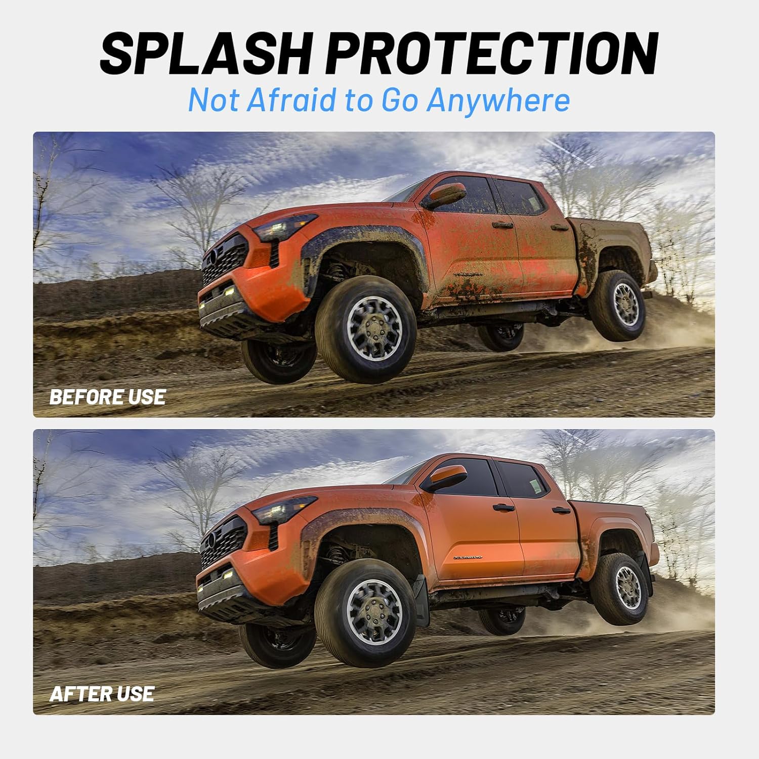 ALL-WEATHER PROTECTION: Designed to defend against mud, water, snow, gravel, and road debris, these splash guards help keep your Tacoma’s exterior clean and minimize paint damage even in harsh conditions.