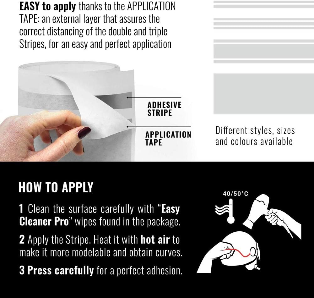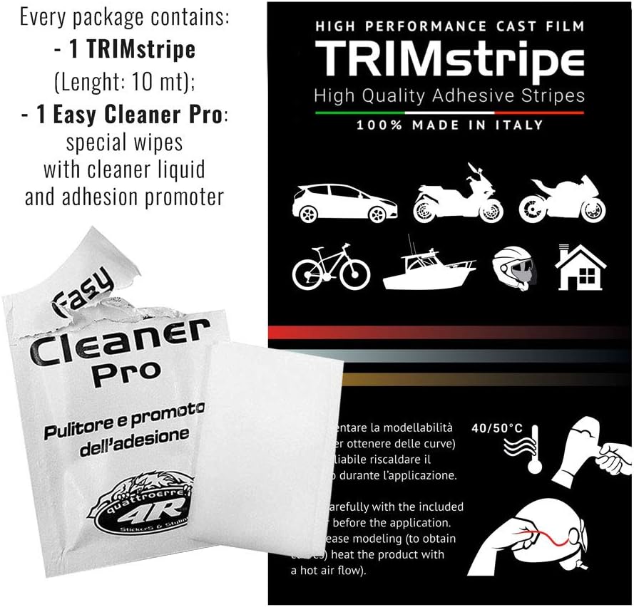 Decorative or functional adhesive strips for cars, motorcycles, bicycles, boating and do it yourself. CAST vinyl with excellent modeling and resistance to atmospheric agents. Thermoformable: by heating the product it is possible to shape it obtaining curves. Each pack contains a cleansing wipe and adhesion promoter. Triple strip, size: 16 mm x 10 meters.