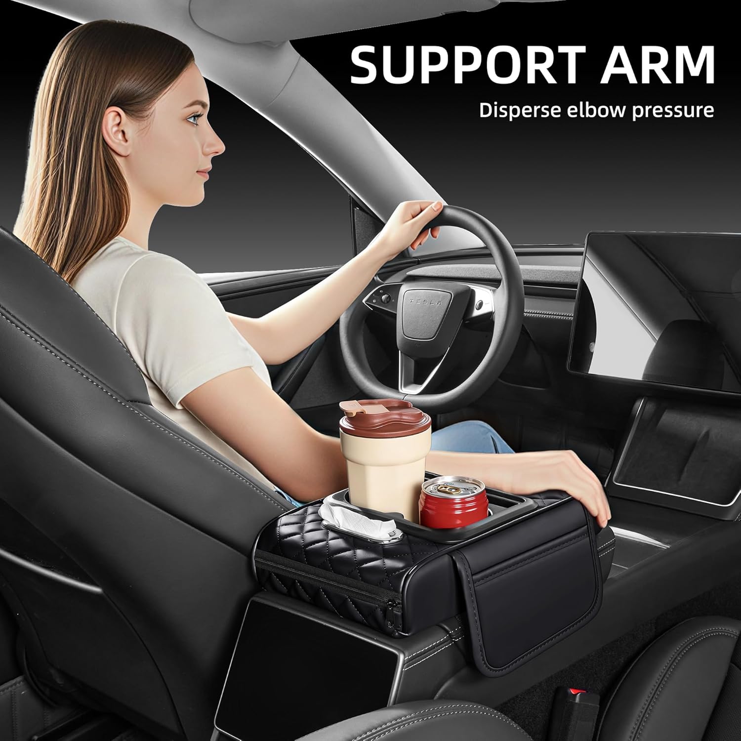 I love it you can put your glass with coffee and your water also covers well and you can carry napkins it is something very cool and you can rest your arm while you drive and relax it is very comfortable. In addition, its sewing matches perfectly with my upholstery, its colors are beautiful. For its price and quality it is an excellent product.