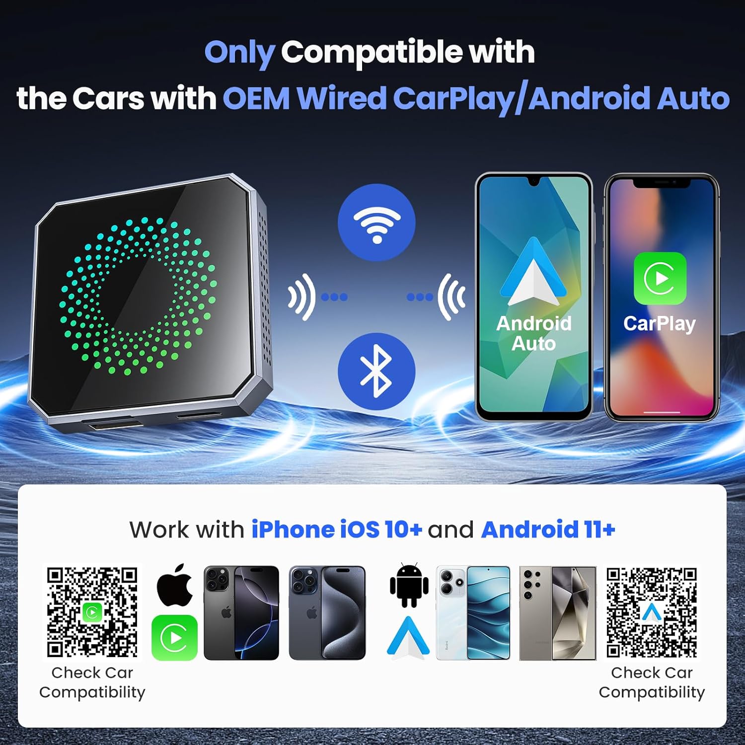 ✅【Compatibility Guide – Please Read Before Purchase】 For a smooth experience, please confirm before buying: ① Your vehicle must support factory wired CarPlay or wired Android Auto and have a touchscreen. ② Not compatible with vehicles that have factory wireless CarPlay. ③ iPhone requires iOS 10.0 or later. ④ Android phone requires Android 11 or later. ❌ Not compatible with Tesla / BMW. Drive with confidence by ensuring compatibility before purchase.