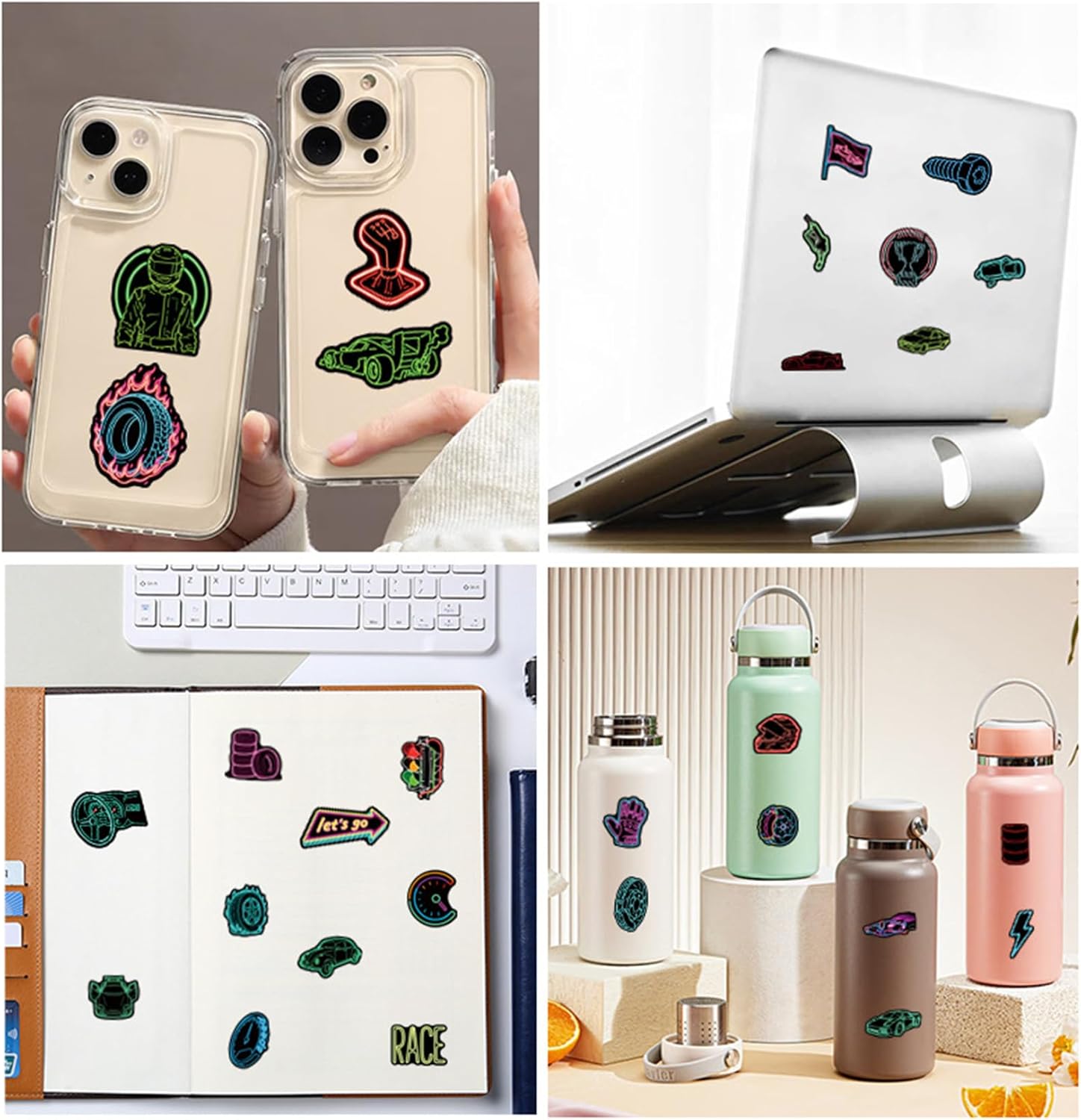 【Package Includes】 — Comes with 50 pcs Neon Car Theme Stickers, each measures about 4 cm –6 cm/1.57–2.36 inch. All the Stickers are 100% Brand New and made with high quality vinyl PVC.