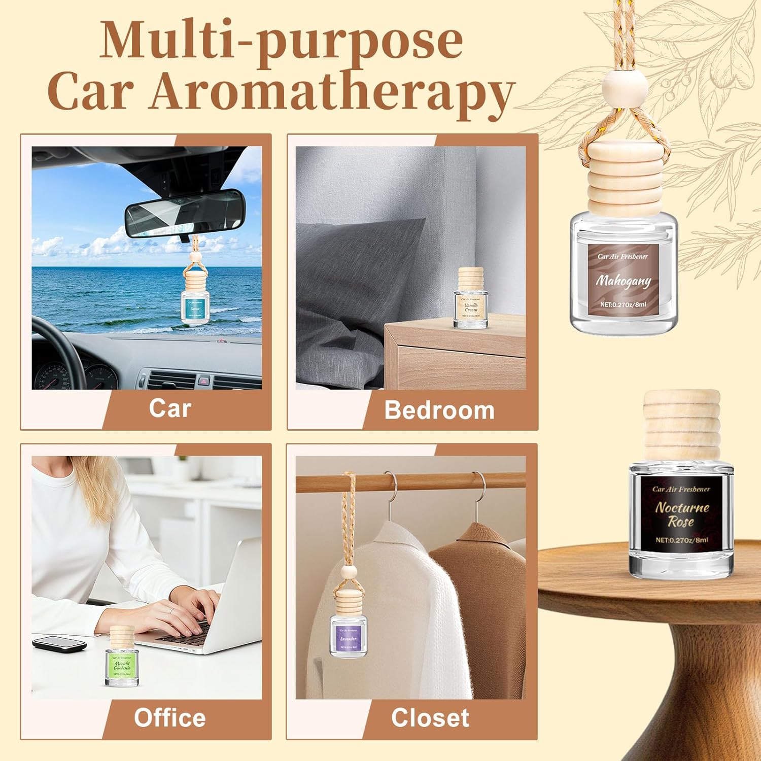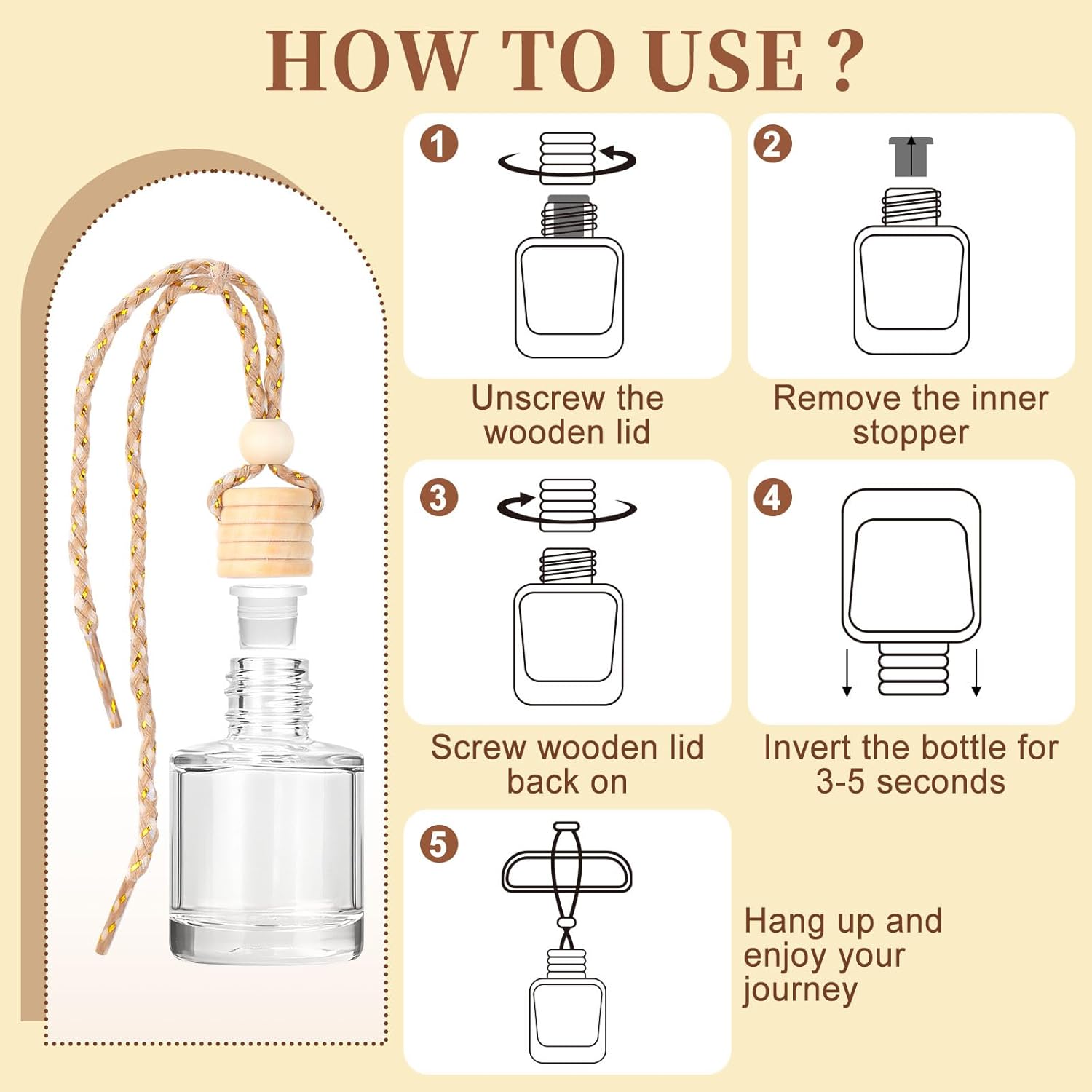【Easy Installation】1.Unscrew wooden lid 2.Remove plastic stopper 3.Screw wooden lid back on 4.Turn bottle over for 5-8 seconds until the wooden lid absorb fragrance oil 5.Hang on the rearviewmirror and adjust the hanging rope