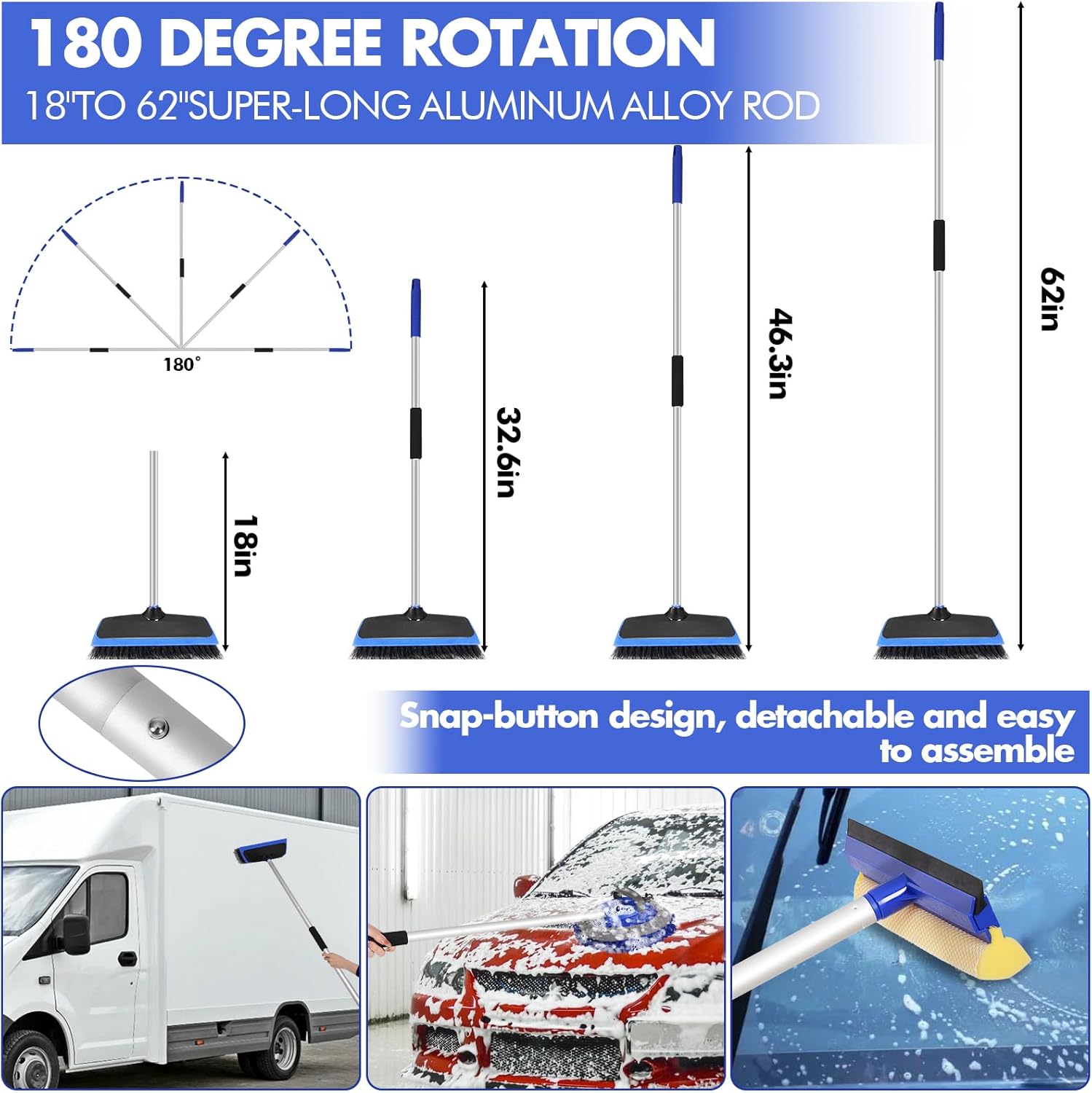 【62″ EXTRA-LONG CAR WASH BRUSH MOP】ANCLO car wash brush consists of 4 high quality sturdy aluminum alloy rods and chenille microfiber brush heads, with snap button design, detachable and easy to assemble. You can easily wash dirt and grit from the roof of cars, SUVs and trucks, as well as hard-to-reach surfaces. Our car wash mop has a non-slip handle that provides a 180-degree cleaning angle and won’t stretch or retract randomly to scratch your car . Make your cleaning easier, faster and more efficient.