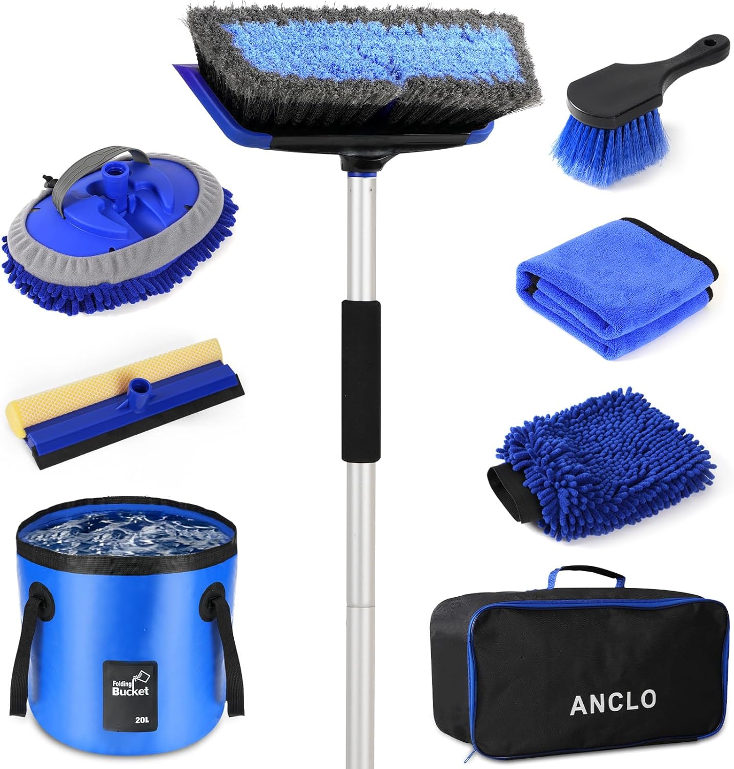 Several things impressed me about this ANCLO car washing set. 1. It comes in a heavy duty nylon bag with zipper and handle, 2. one of the extension rods has a padded grip, which is so nice when using it at it’s full extension, 3. the poles lock into place so you don’t have to worry about a telescoping pole collapsing, 4. all of the components are high quality (NOTE: in the video review I said the squeegee had a plastic blade – it’s tough silicone). and 5. the set comes with everything except cleaning products! It even has a bucket, which I love- it’s foldable – so the whole thing is portable and takes up very little room in the trunk.Regarding performance – the swivel head on the dual-use “mop head” brush makes it easy to use and it does a fantastic job even without flow-through features. The mop head design leaves a clean finish. The tire cleaning brush is on the soft side and isn’t the best tool for jobs that require an aggressive scrub.Overall, this is a great set and great buy for all these tools with the carrying case.