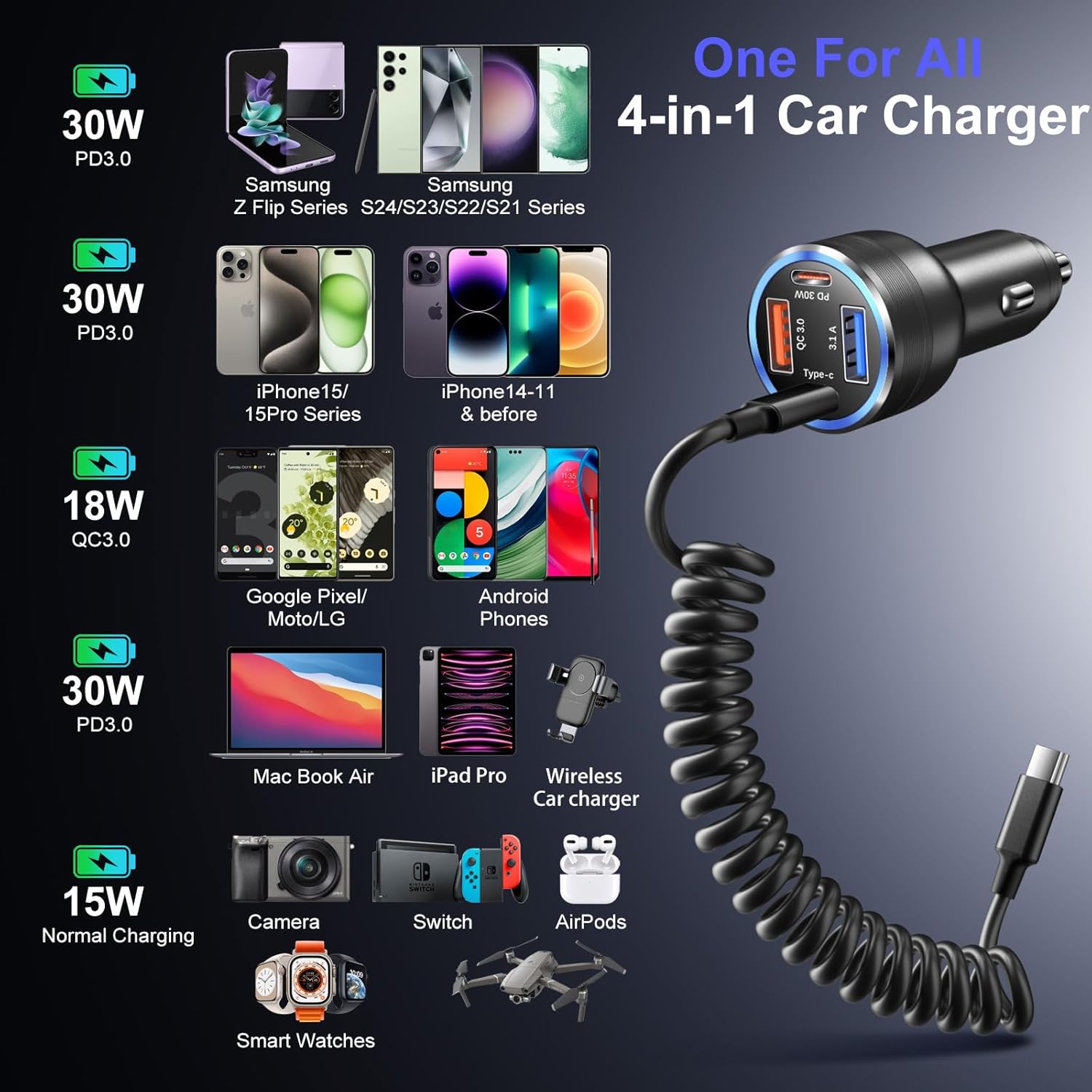 [12V to USB C & USB A Car Charger] 4-in-1 multi port car charger designed with 2 USB-C and 2 USB-A charging ports, enable you to charge multiple devices at the same time. The USB-C PD 30w port can fast charge the high speed needed device, like Samsung Galaxy S24 S25Ultra S23 S22 Plus even Galaxy Tab S10+. The USB-A QC Port can rapid charge most android devices from 0% to 80% in 35 minutes.