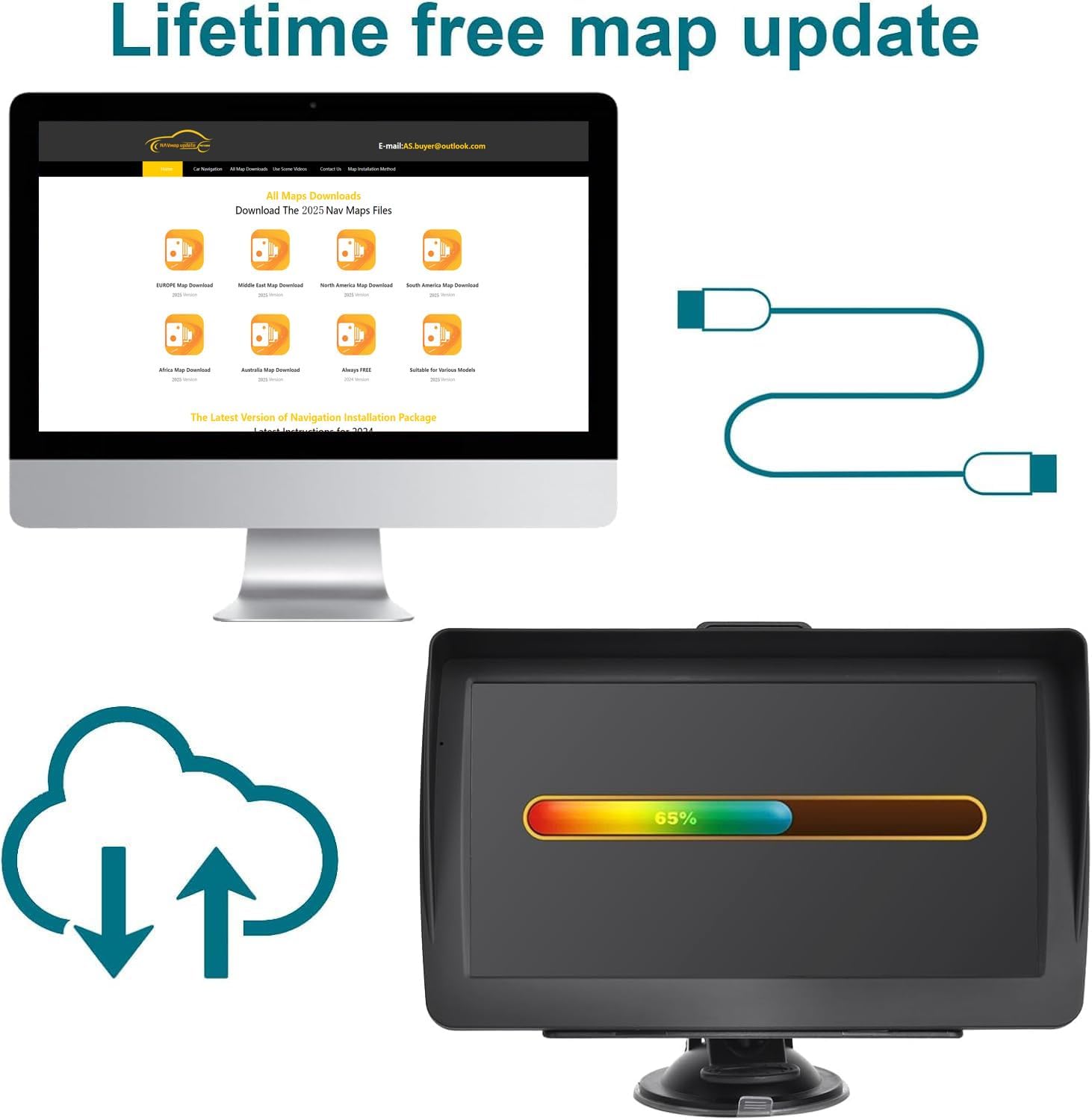 We offer lifetime free map updates. We have pre-installed maps of Canada, the United States, Mexico, and are willing to provide maps of Europe/South America/Southeast Asia/Middle East. See the manual for more details