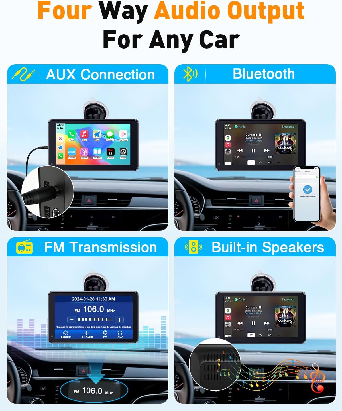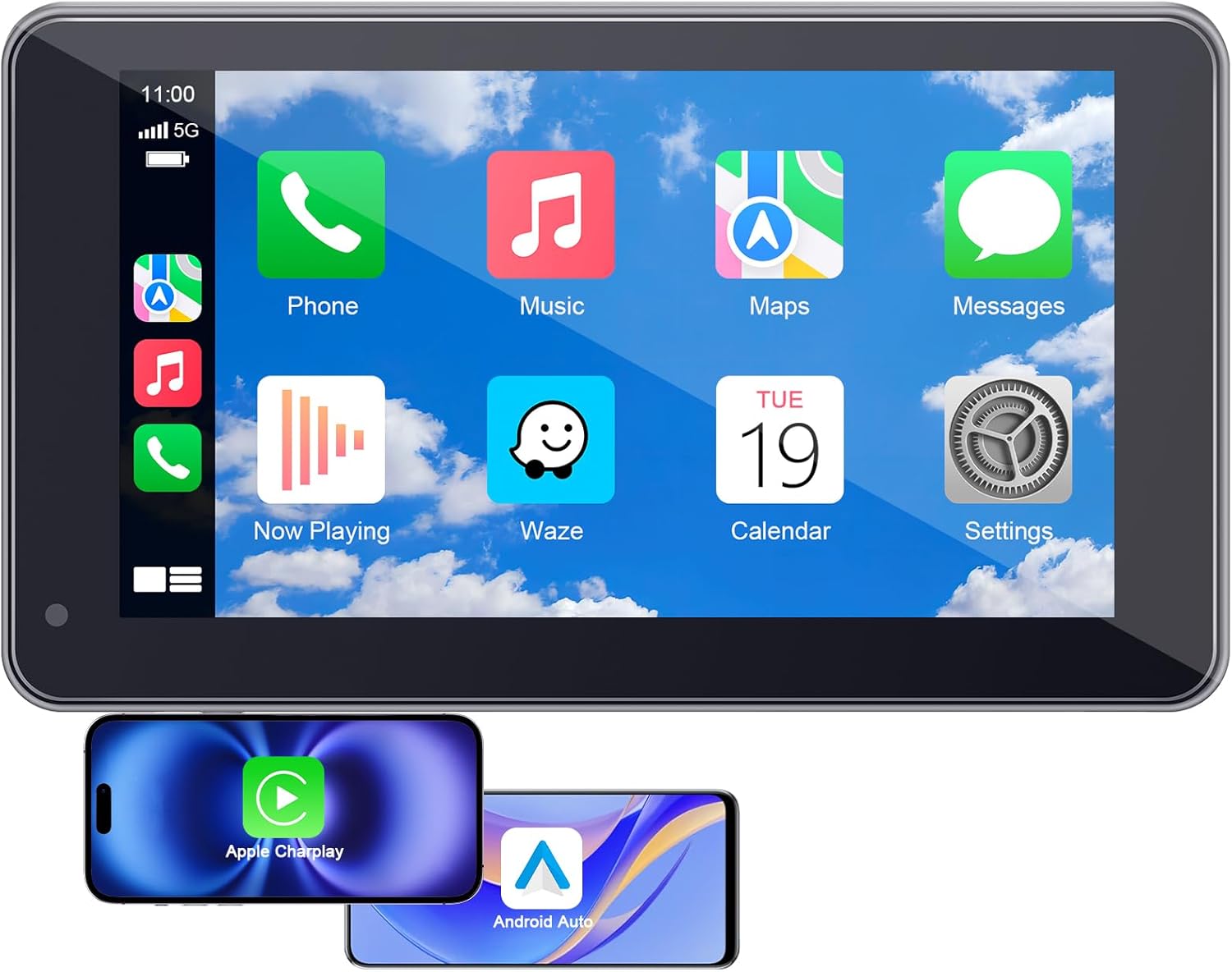 7” Wireless Apple CarPlay & Android Auto Screen – Portable Car Display with AirPlay, Screen Mirroring, FM/AUX Audio, Easy to Install, Convenient Upgrade for Older Cars, Families, Commuters
