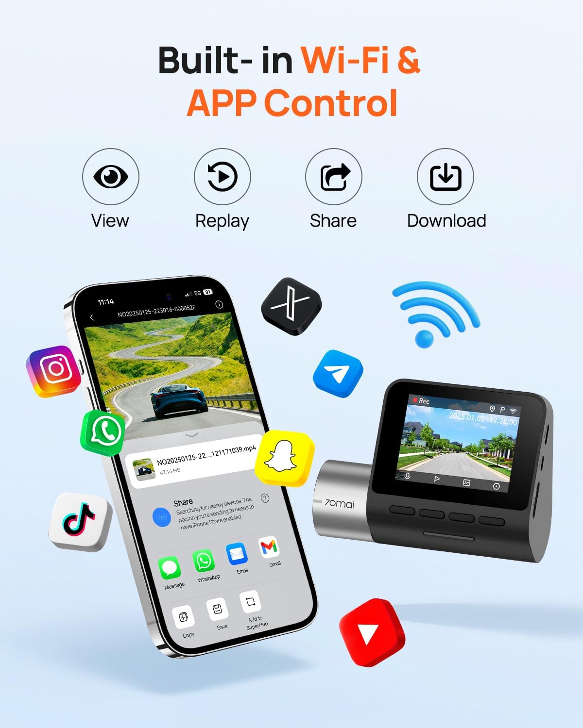 【Built in WiFi-App Control and Video Sharing】You can connect the A500S dash cam to the 70mai APP via built-in WiFi, and easily preview and download videos, change camera settings. It only takes a few steps to send videos, allowing you to handle accidents and share travel moments faster and easier. In addition, you can also achieve OTA updates through the software