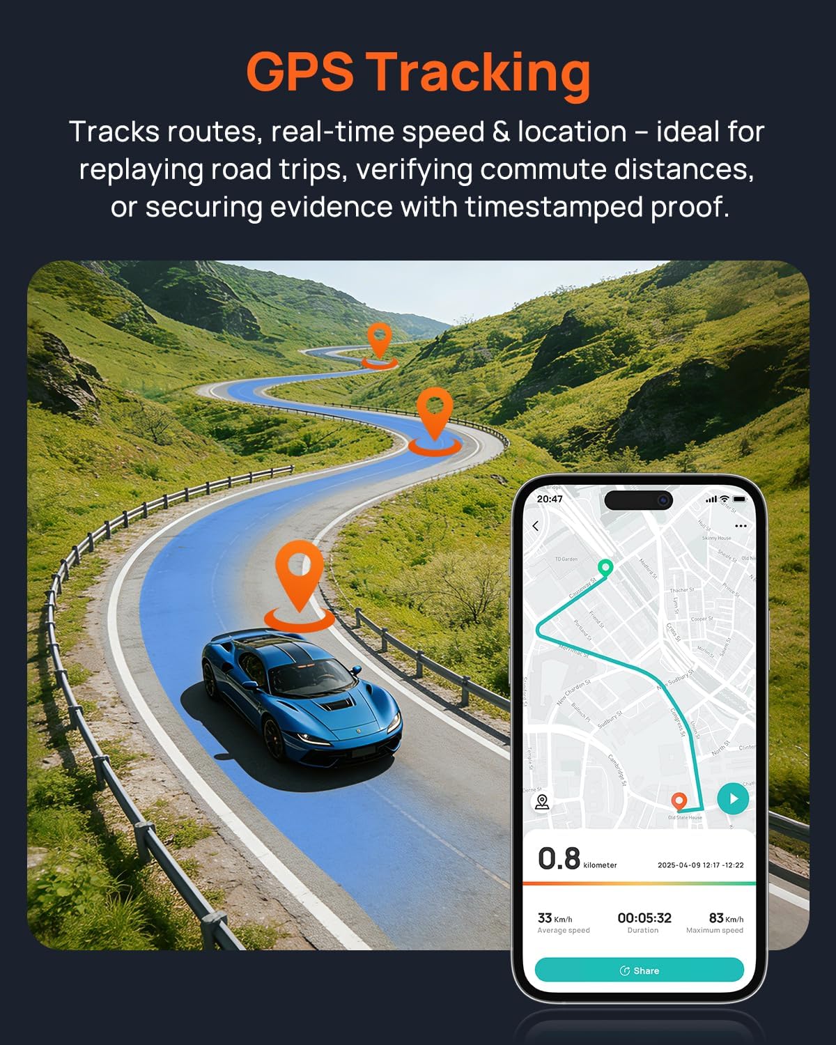 【Built-in GPS & Route Tracking】The built-in GPS function of the dash cam front A500S provides accurate geographic location and automatically saves your driving trajectory, ensuring that you can view and analyze your trip at any time. (Warm Tips: All customer data is only saved locally. 70mai will not disclose your data or private information for commercial purposes or any other intentions.)