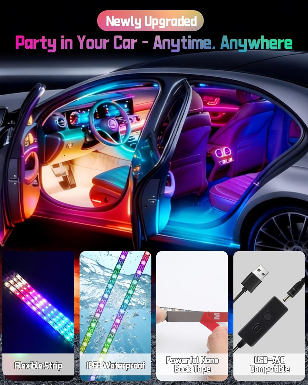 【Wide Application】Ideal for Cars, SUVs, UTVs, ATVs, RZRs, Jeeps, Vans, Pickup Trucks, Motorcycles & Boats. With the USB power supply universal adapter, it works with various power sources, suitable for interior/exterior use (underglow, grille, deck, dash, footwell lights, etc.). Perfect for daily commutes, road trips & special events, adding style to any ride.
