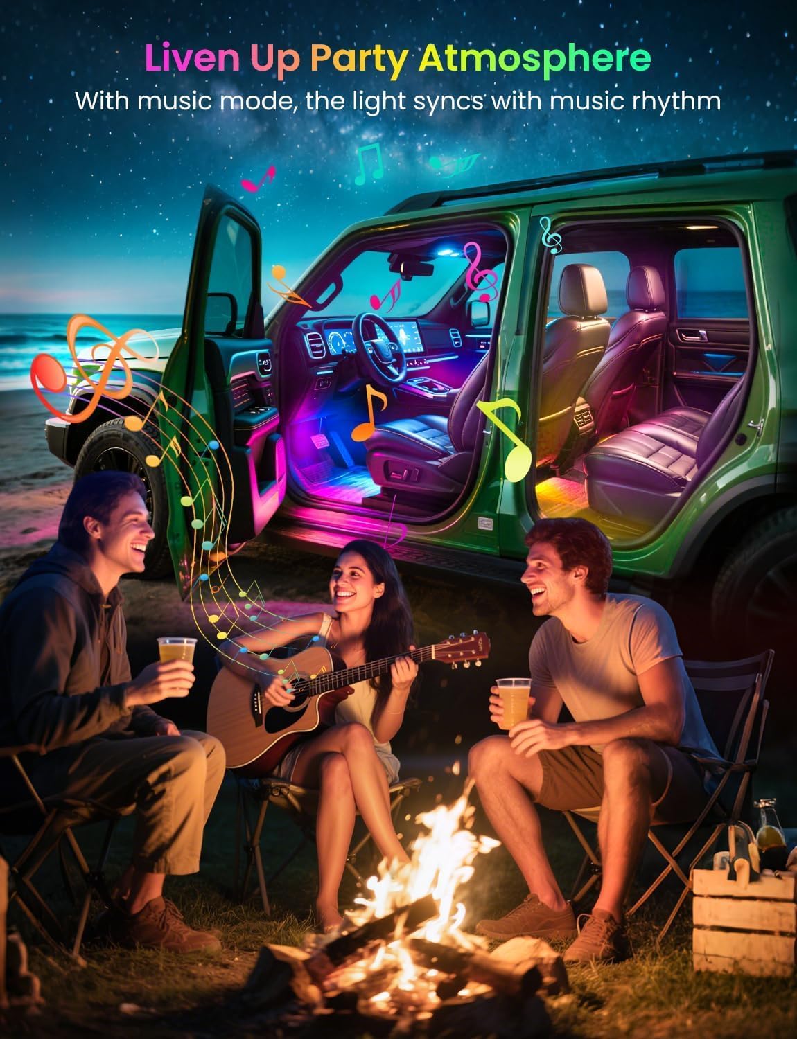 【Dynamic Music Sync】 The car lights interior with built-in microphone help to sync the ambient lighting car interior with any kind of music. Make your daily commute, road trip, or weekend vacation full of vitality and eliminate fatigue, with colors dancing with your favourite songs, enhance your driving pleasure.