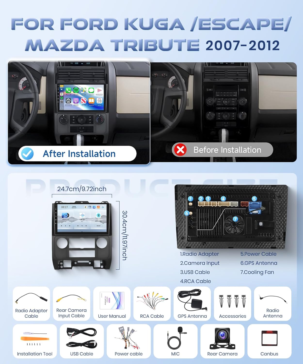 for Ford Escape Carplay Radio Replacement: for 2009 Ford Escape car radio support wireless carplay and wireless android auto. can make calls, send messages, play music, navigate with just your voice or touch. For 2010 Ford Escape car radio support IOS/Android mirror link, use USB cable or WIFi, mirror your phone’s screen on the device’s display, You can use your phone’s apps, music, videos, etc on the device.