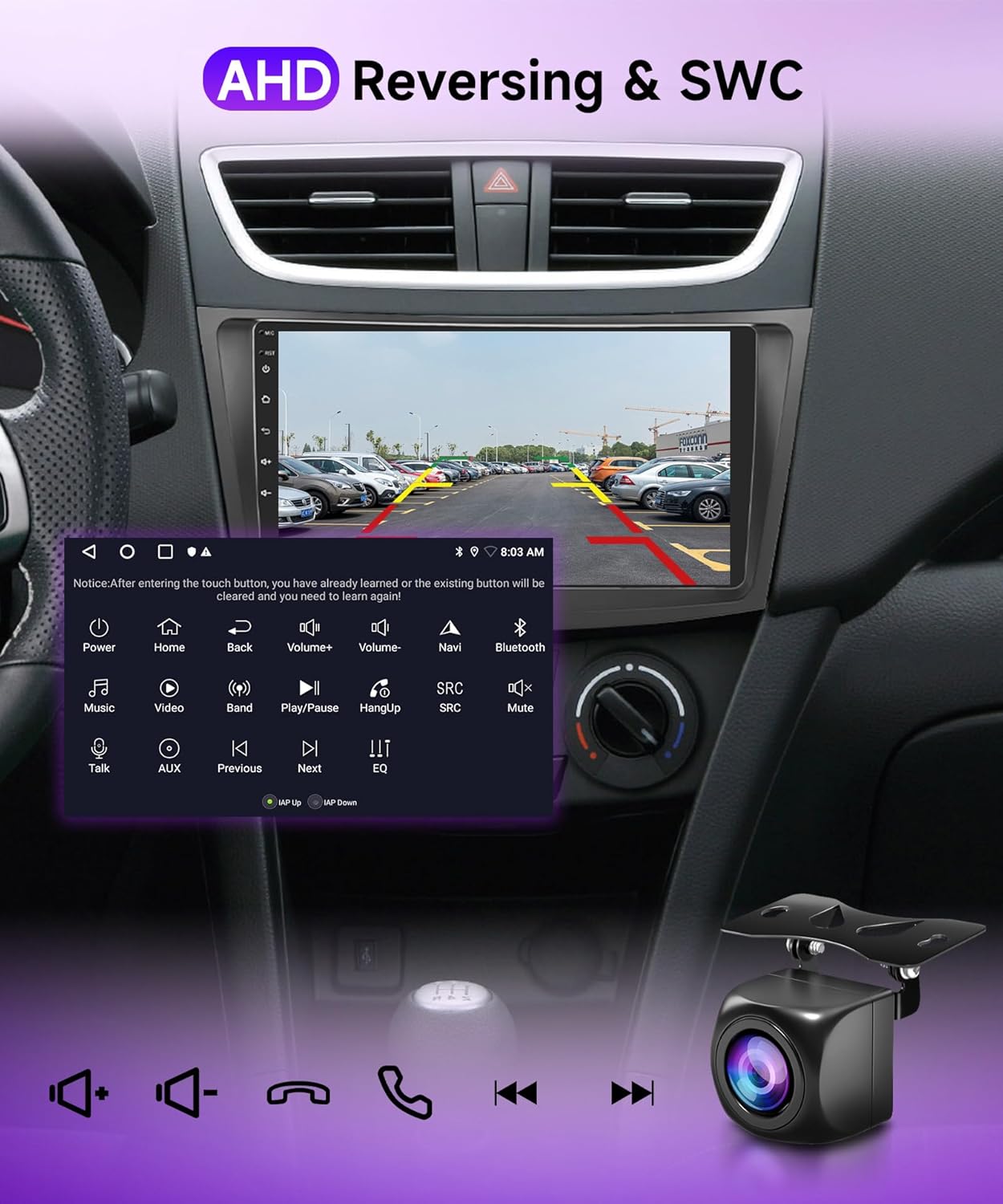 Reversing camera and Extra features: for 2012 Suzuki Swift radio connect a reversing camera to the device via video input port, and view the rear view of your car on the device’s screen when you shift to reverse gear. This helps you park safely and avoid obstacles. for 2013 Suzuki Swift stereo support Intelligent voice assistant Network radio, Global Weather display funtion, escort for your travel. Note: Requires additional purchase to use.