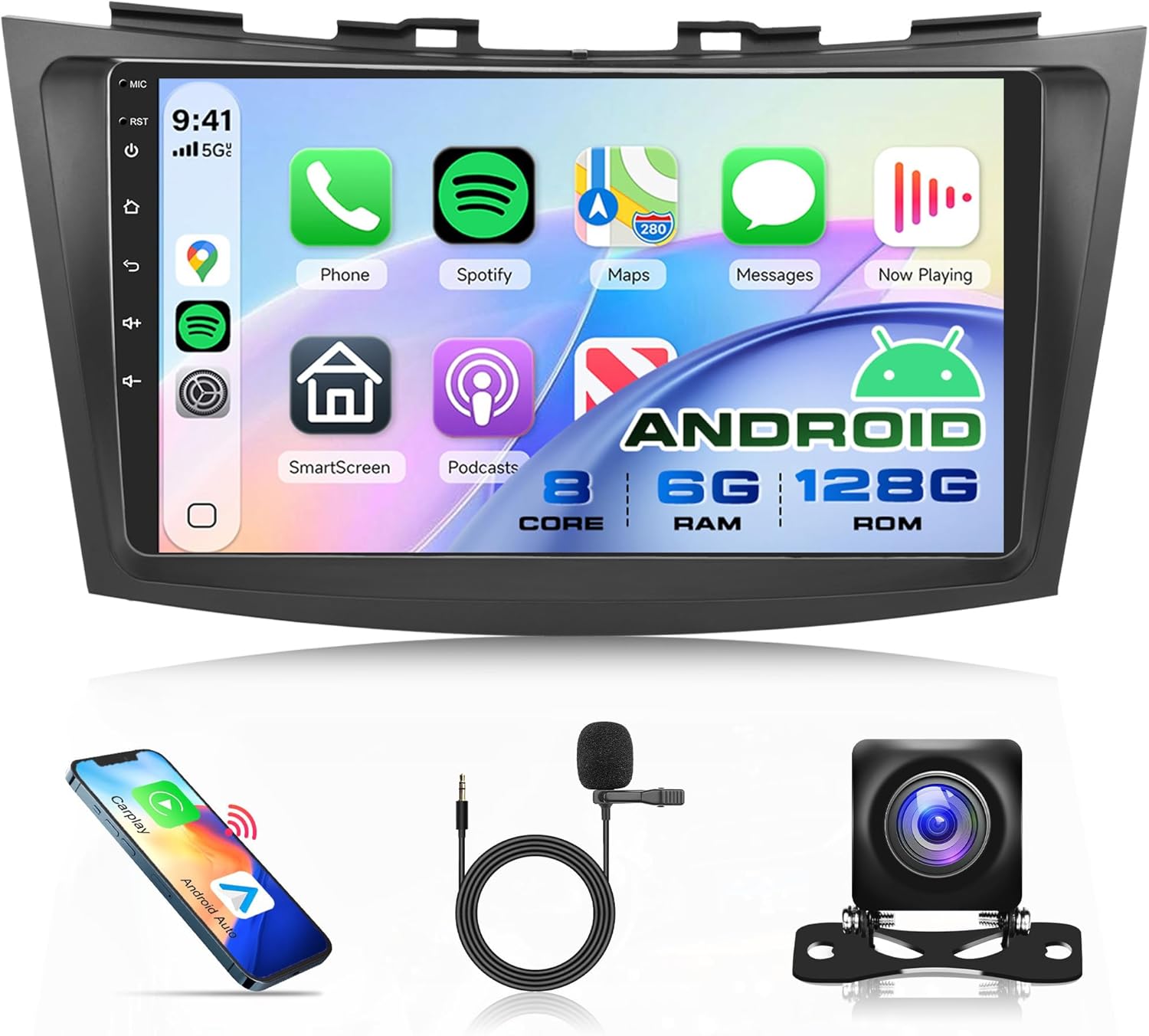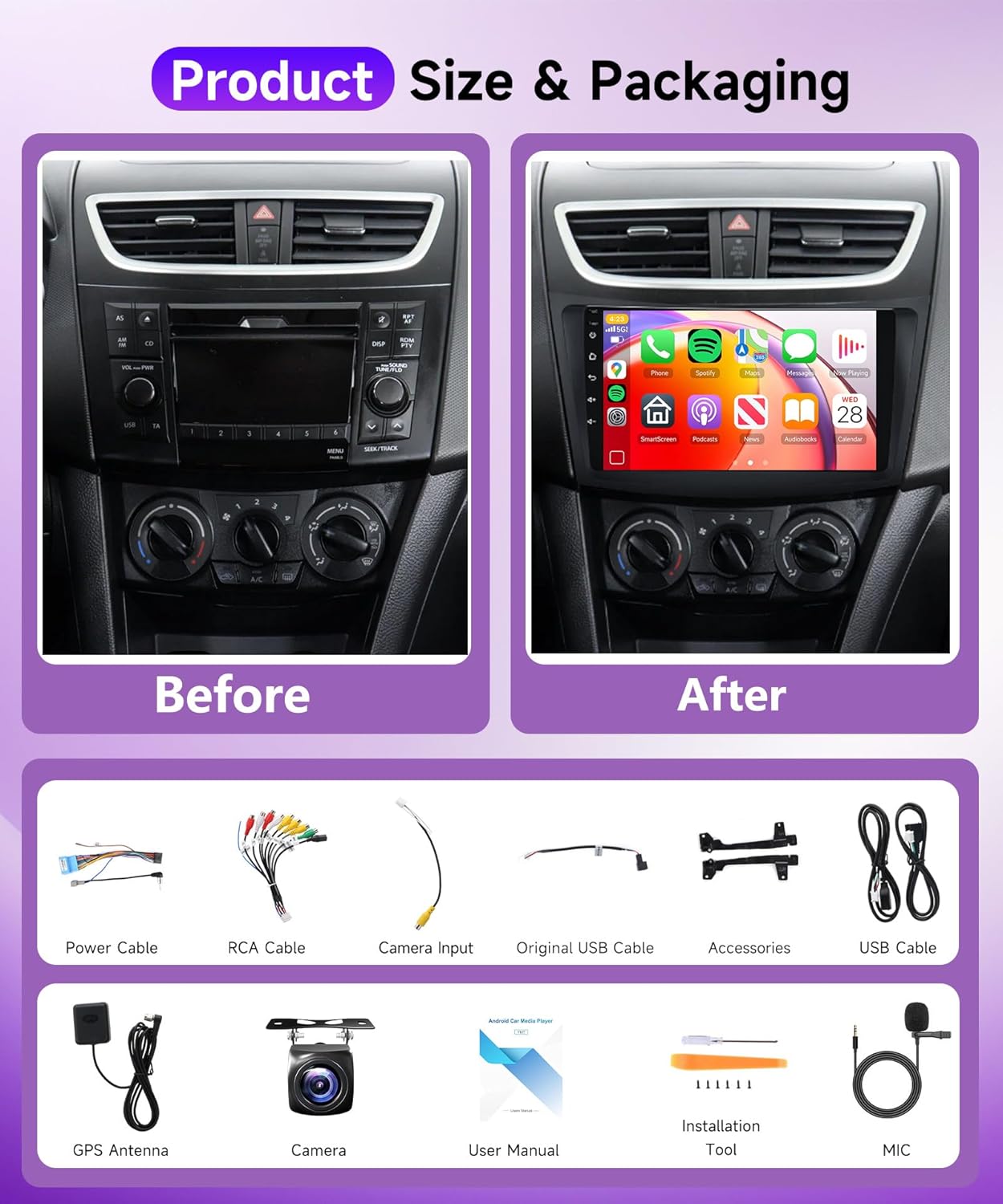 Compatible Vehicles: Android car stereo carplay for Suzuki Swift 2011-2017. Carplay stereo equipped with android system, 8 Core CPU, Memory:6GB (RAM)+128GB (ROM) with powerful and stable processing and storage, with no lag or delay. 9 inch IPS touch screen: Enjoy a large and clear display with responsive touch control, which allows you to operate the device easily and comfortably. With double USB port.