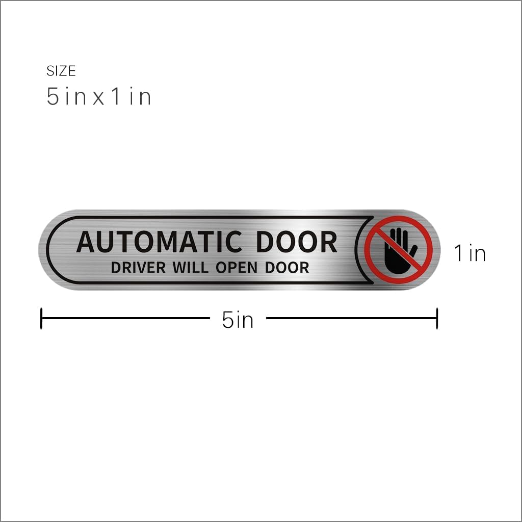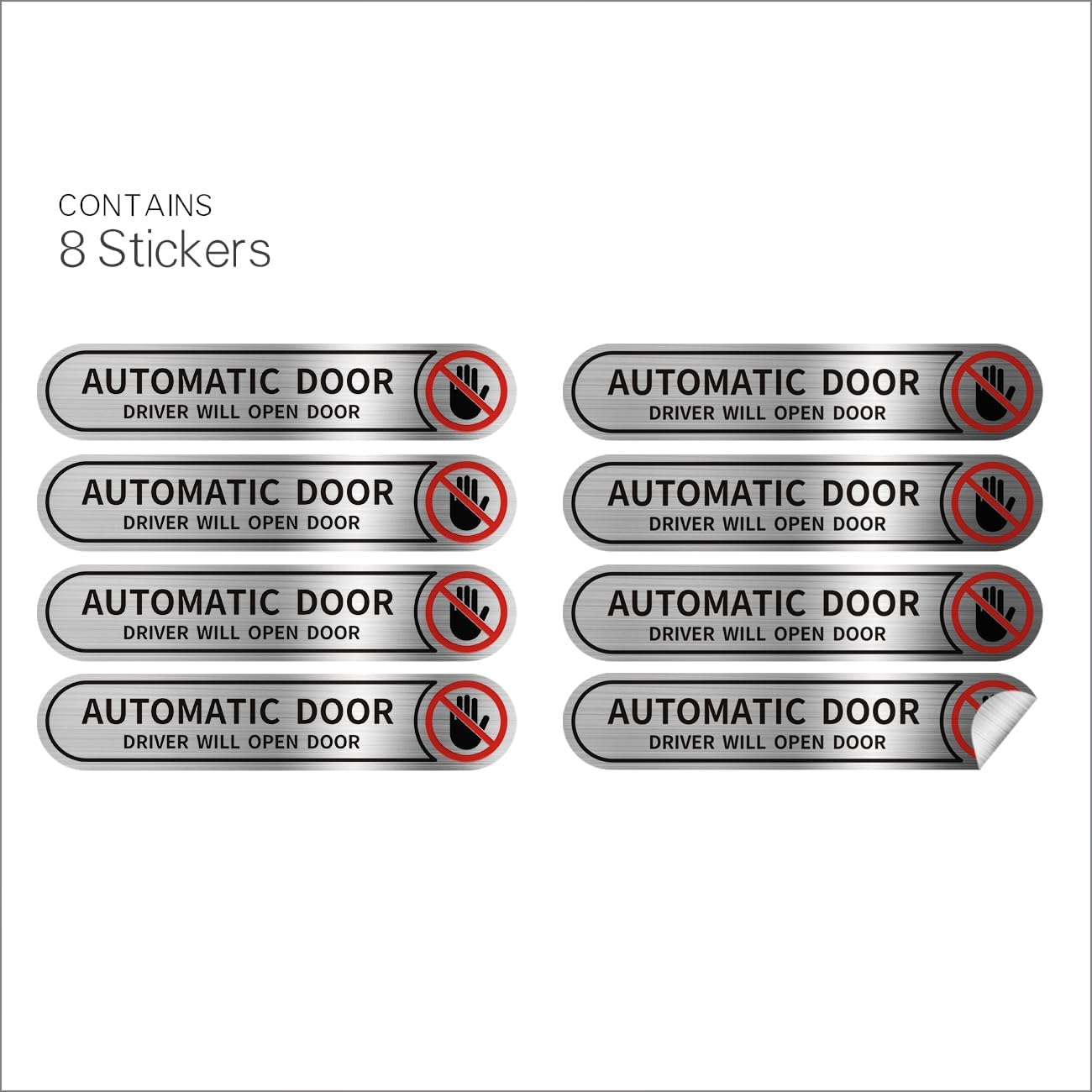 -Set includes 8 piecesAutomatic Door stickers, Size 5x1in. -Material: Made from vinyl Brushed Silver Sticker, it looks like metal, but it’s not metal. The sticker is thin but very strong, waterproof and resistant against scratches. -This Automatic Door Driver Will Open Door stickers Let people know that this is an automatic door and not to damage it by pulling hard. It can be posted on your car window, door, or wherever a special reminder is needed. -The stickers are very easy to use, with a strong adhesive on the back, just clean and dry the glass surface, peel off the release sticker and stick it on.