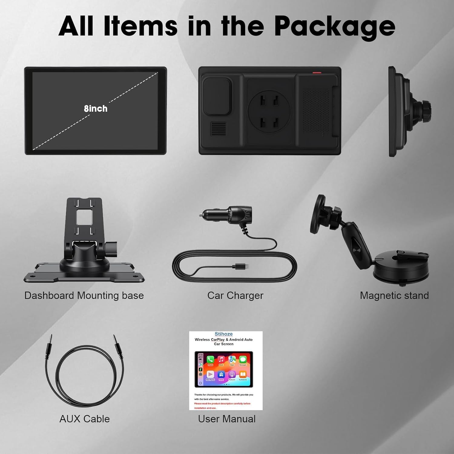 Easy installation & 24 Months Guarantee: Mount the Carplay Screen on the windshield with the suction cup, and attach the backup camera, please use the car charger in the kit to plug into the vehicle cigarette lighter to power the screen to ensure it works properly. Additionally, Stihoze provides 24 months guarantee and 24/7 customer support. Our aftersales team is always ready to assist you with any inquiries or concerns. Drive with peace of mind, knowing that we’ve got you covered
