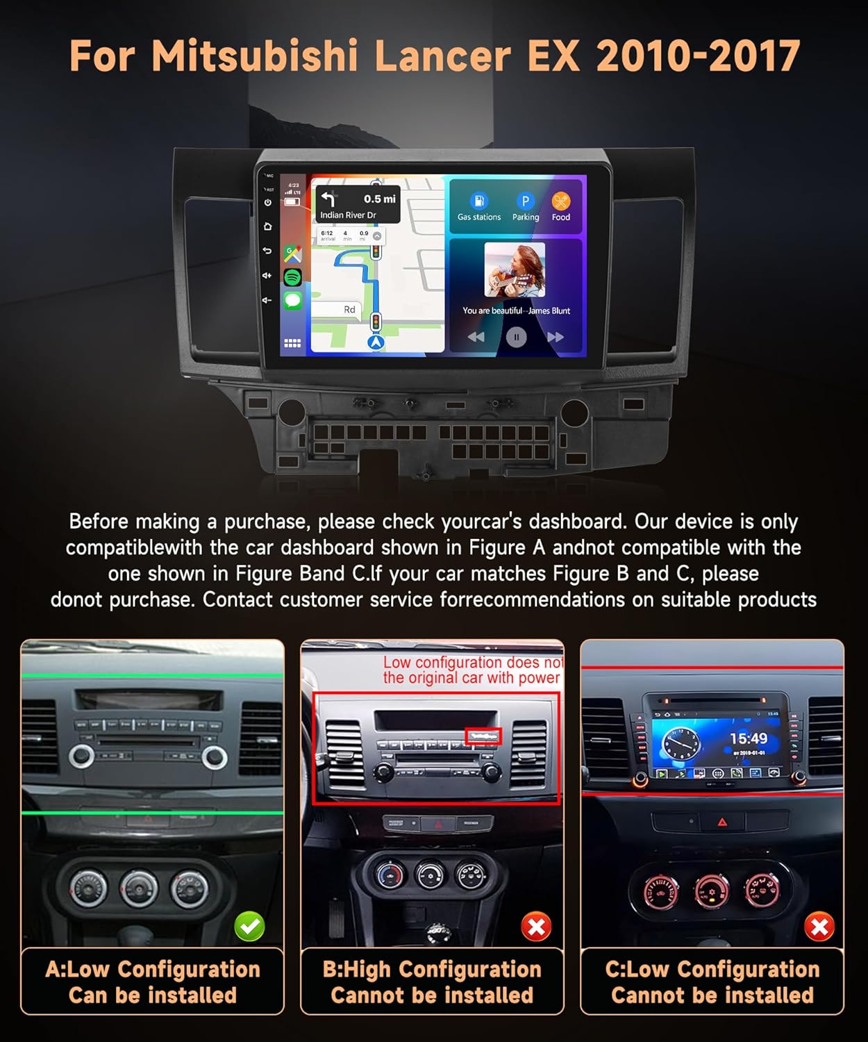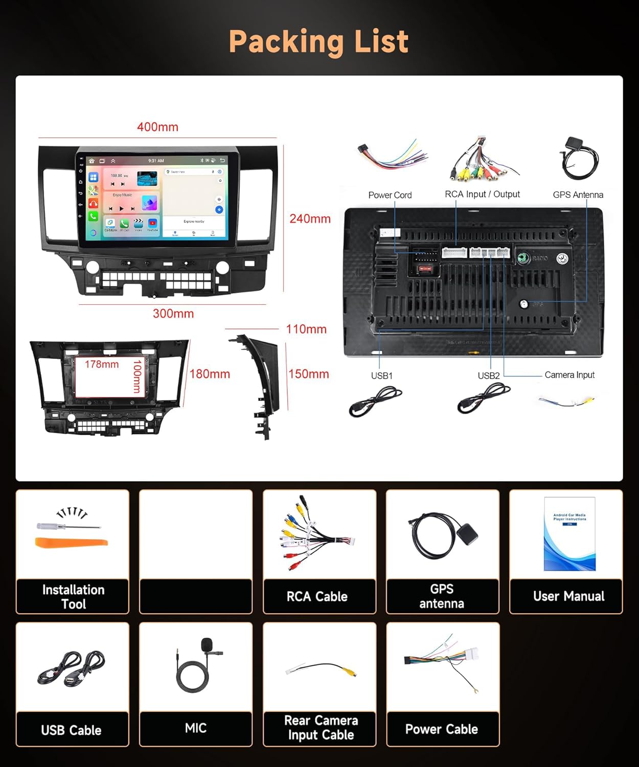 8 Core Car Radio for Mitsubishi Lancer: Android car stereo carplay Compatible Vehicles: for Mitsubishi Lancer 2008-2017. Carplay stereo equipped with android system, 8 Core CPU, Memory:4GB (RAM)+64GB (ROM) with powerful and stable processing and storage, with no lag or delay. 10.1 inch IPS touch screen: Enjoy a large and clear display with responsive touch control, which allows you to operate the device easily and comfortably. With double USB port.