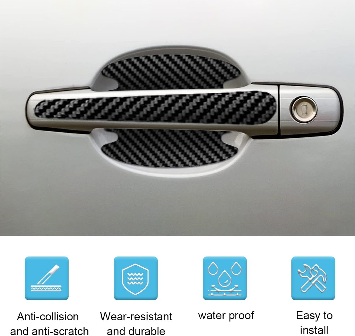 These car door handle protectors are made of high-quality carbon fiber leather. They are waterproof, self-adhesive, and weatherproof and protect against scratches and abrasions.