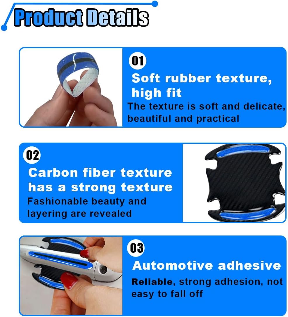 【High-Quality Material】:Door handle reflective adhesive with high-quality environmental protection PVC soft adhesive, strong and wear-resistant, not easy to fall off or deformation, waterproof and self-adhesive, easy to paste and remove, tear off no marks, will not damage your car paint, the surface of carbon fiber texture, full of modern.