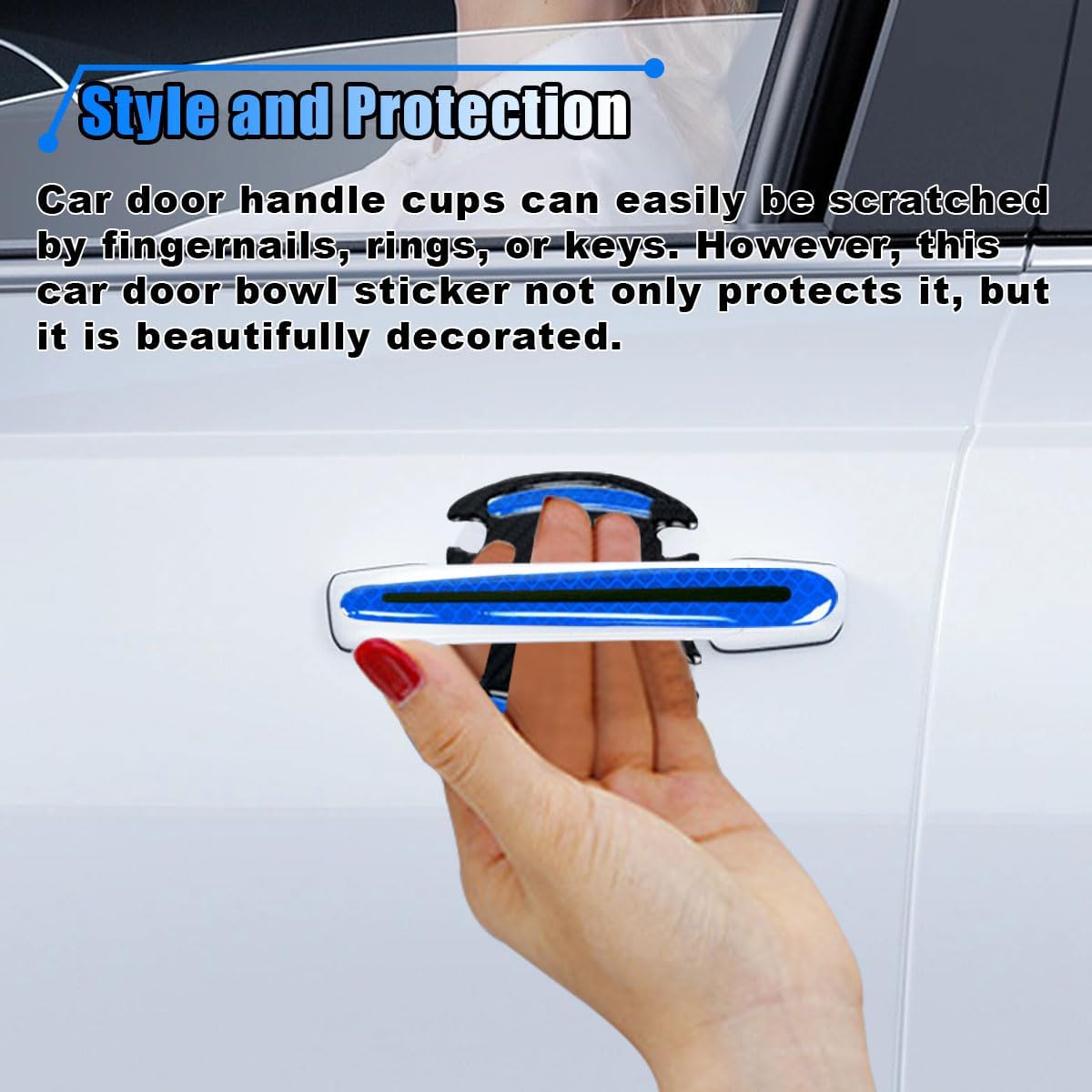 【Anti Scratch Protection】:Car door handle protective film is mainly used to protect the position of the door handle, which can prevent your car from being scratched by fingernails, rings, or keys, and can effectively cover the scratches to keep your car in its original condition. Doorknobs reflect light at night, helping to improve night driving safety.