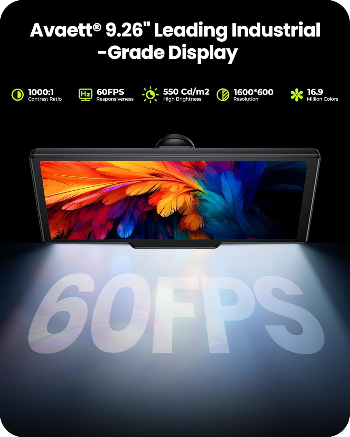 High-End Car Play Screen: This wireless CarPlay screen features industry-leading high-end technology, offering a true 9.26-inch visible screen with a precise 1600×600 high resolution. Built-in precision sensors deliver 16.9 million vibrant colors, providing an ultra-clear, lifelike, and smooth visual experience. With a meticulously crafted structural design and premium components, the screen is durable and temperature-resistant, operating normally in temperatures ranging from -4℉ to 158℉.