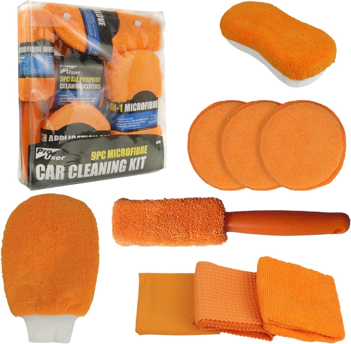 9-Piece Car Wash Cleaning Kit: This value-packed car cleaning and care set includes the most commonly used tools for auto detailing: 1*Wheel Brush, 1*Figure-Eight Microfiber Mesh Sponge, 1*Double-Sided Microfiber Wash Mitt, 3*Wax Applicator Pads, and 3 types of cleaning towels — Glass Cleaning Towel, Microfiber Cleaning Cloth, and Waffle Weave Towel.