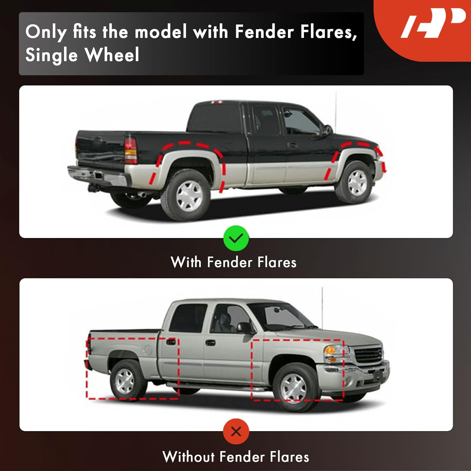 [Vehicle Fitment-2]: Compatible with GMC Sierra 1500 1999-2007 // Sierra 1500 HD 2001-2003 2005-2006 // Sierra 2500 2001-2004 & Sierra 2500 HD 2001-2007 & Sierra 3500 2001-2006 – (Only fits for Single Rear Wheels) // Yukon 2000-2006 // Yukon XL 1500 2001-2006 — Note: It fits the model with Factory Fender Flares
