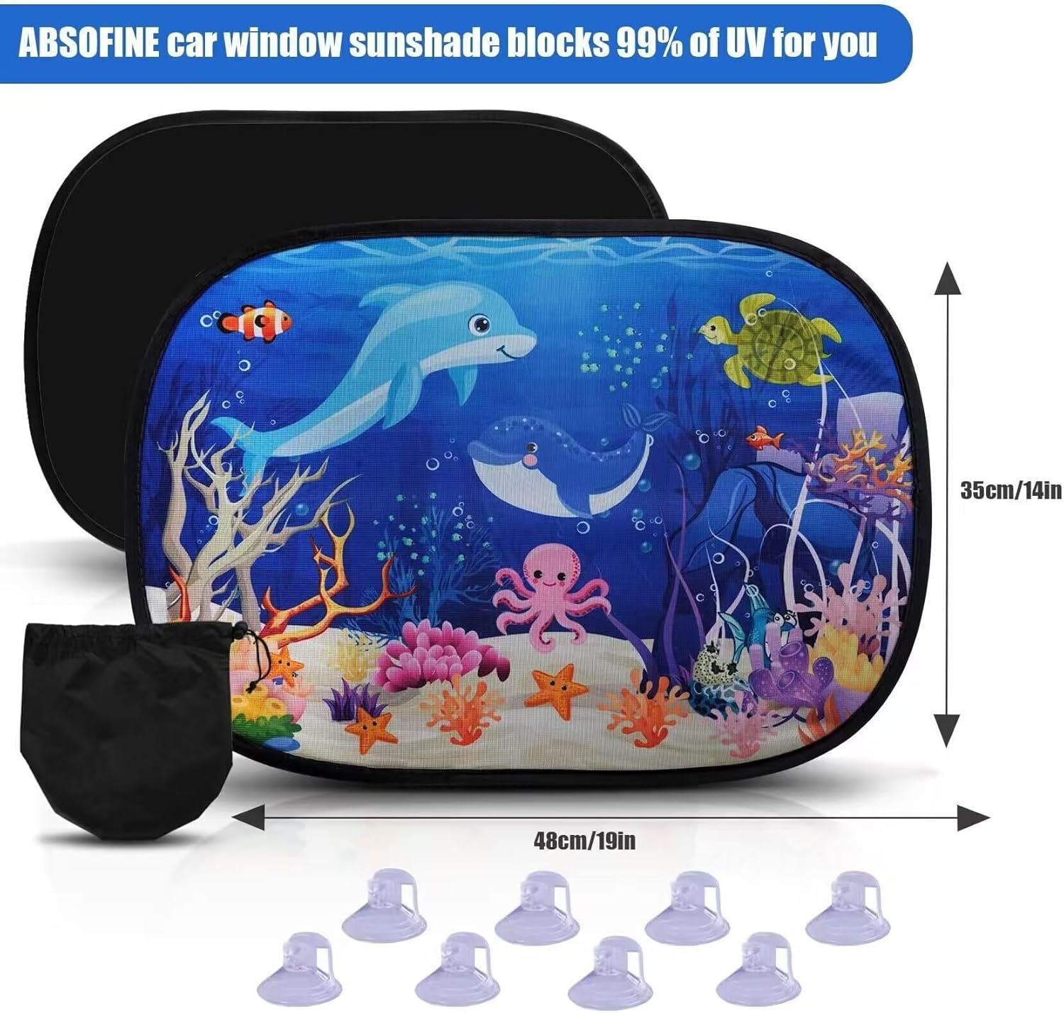 Product Content: 2 pack car window shades, 8 clear suction cups, comes with a compact storage bag, making it easy to carry and store the sunshades when not in use. Providing everything you need for effective sun protection on the go.