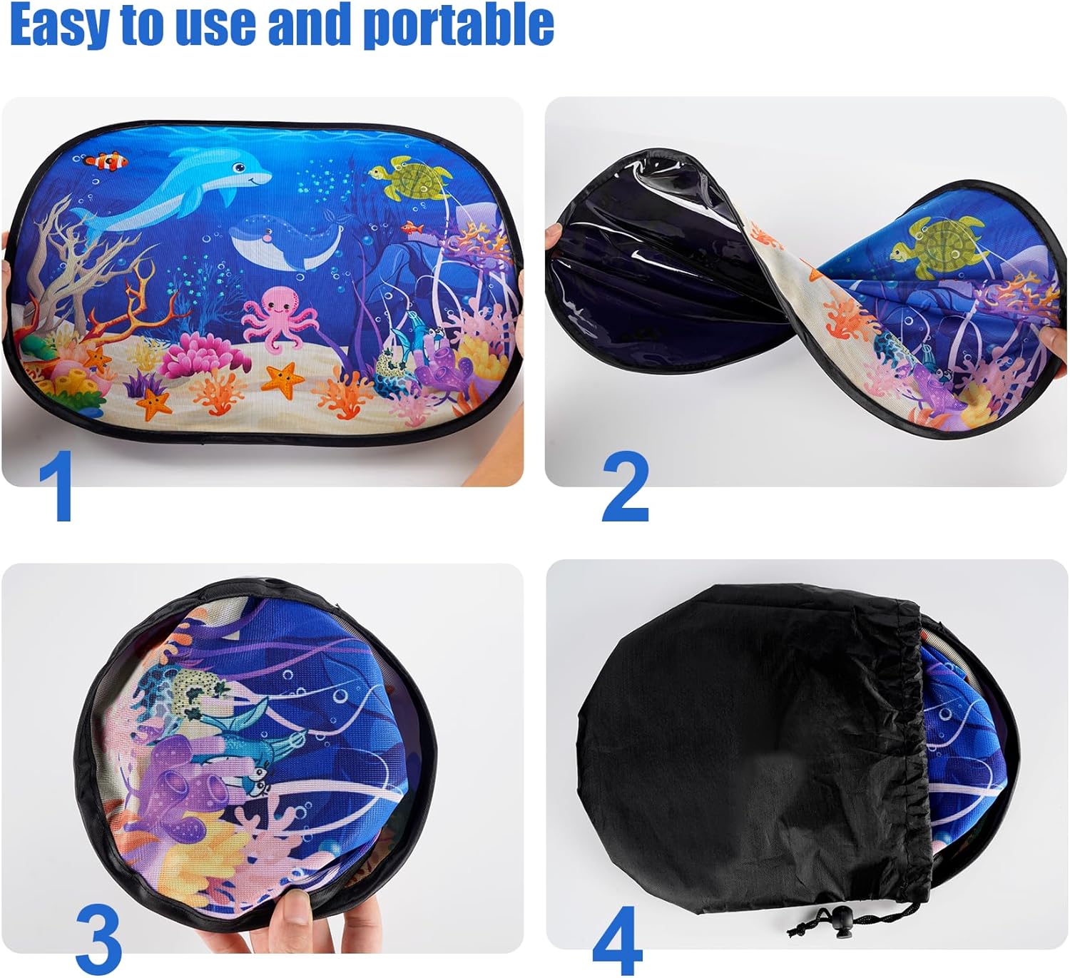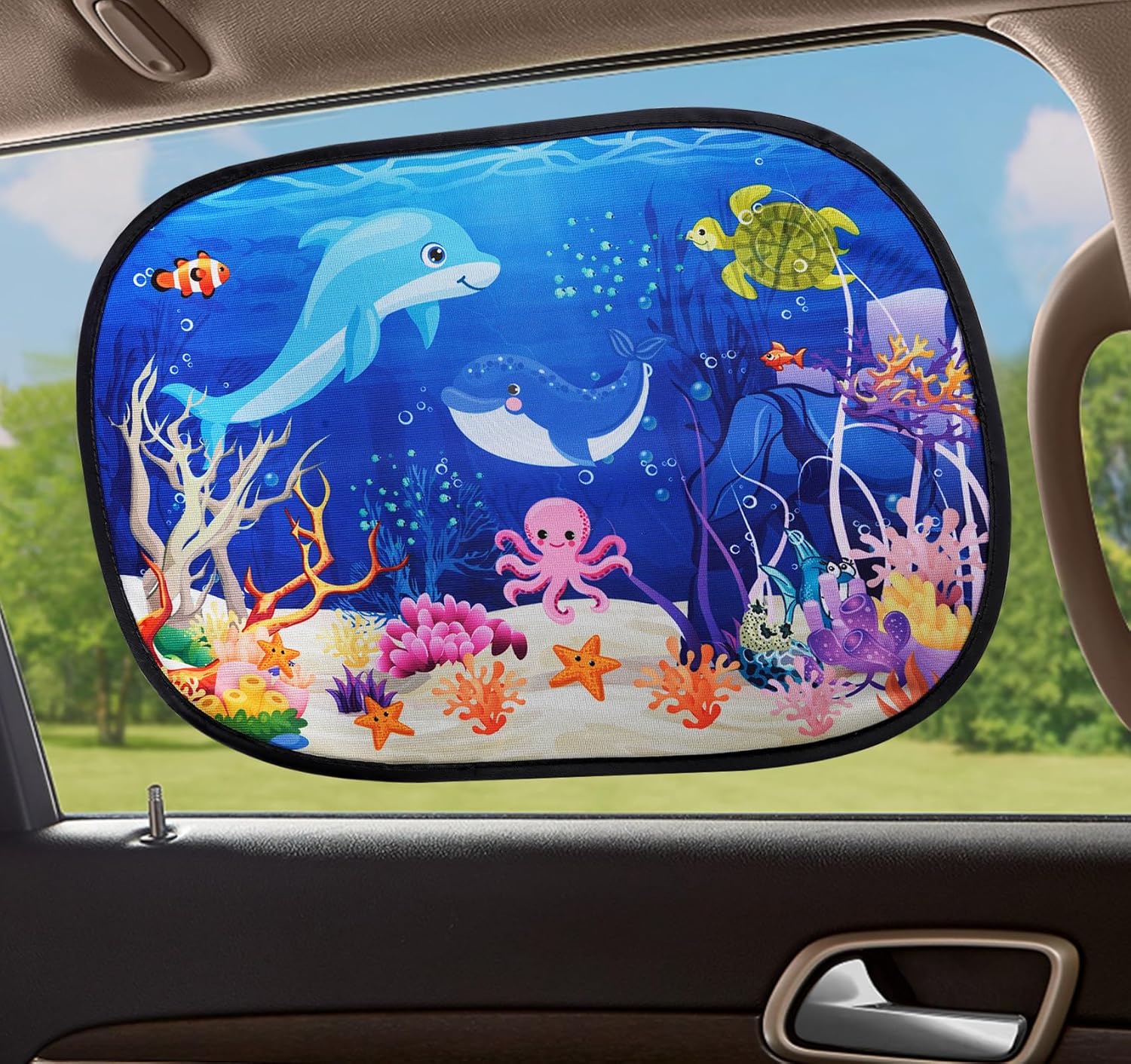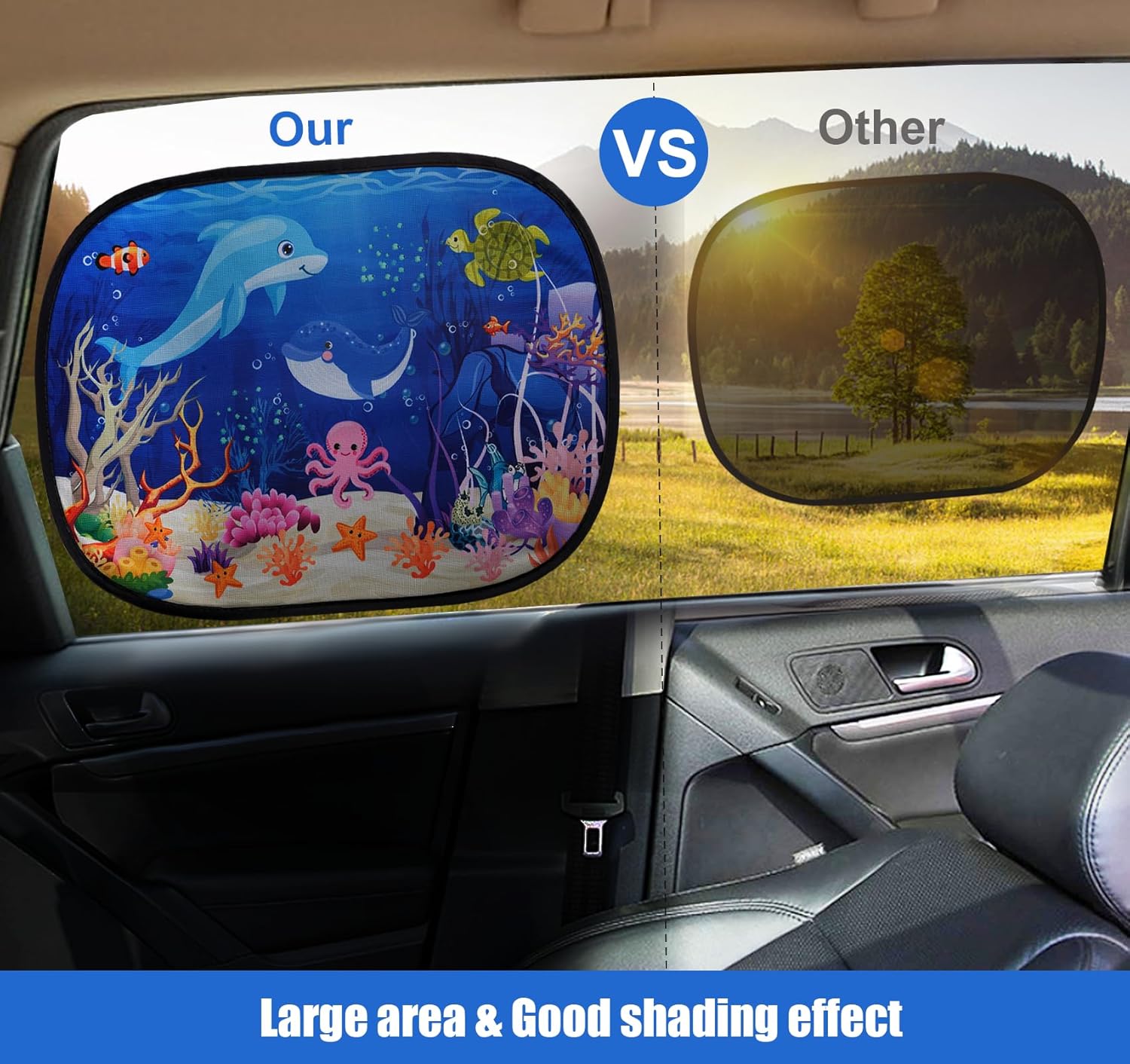 Stylish Ocean World Design: Featuring a vibrant “Ocean World” color theme, these sunshades add a touch of elegance to your car’s interior while providing reliable sun protection. These car window shade block harmful UV rays while ensuring optimal airflow, keeping your car cool and comfortable.