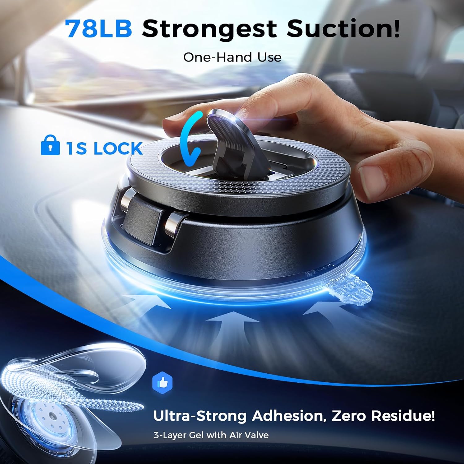 【Lever-Lock Suction Built to Hold】This phone holder car uses a press-to-lock lever for true one-hand use and less strain. This phone holder stays firm over bumps and hard stops. Its 3-layer nano-gel suction cup supports 78 lb and withstands −40°F–300°F. Tested 10,000+ cycles & 200+ reattachments; after cleaning, regains up to 99% suction, keeping the mount rock-solid so information remains readable at a glance.