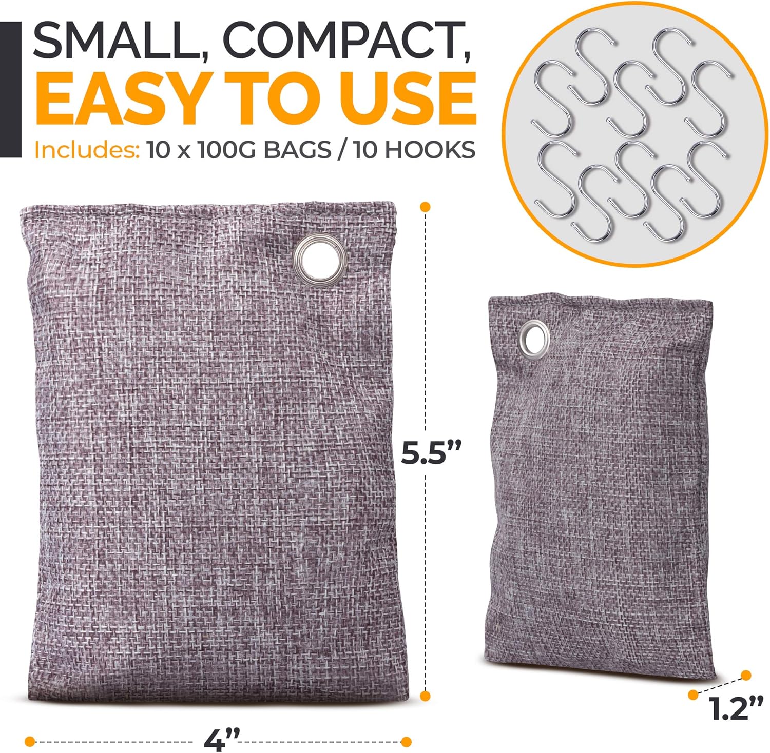 10 CHARCOAL DEODORIZER BAGS WITH HOOKS. Our 3.5oz bamboo charcoal bag musty smell eliminators are the perfect size to place wherever you have a bad smell: closet, car, shoes, gym bag, basement, pet areas.