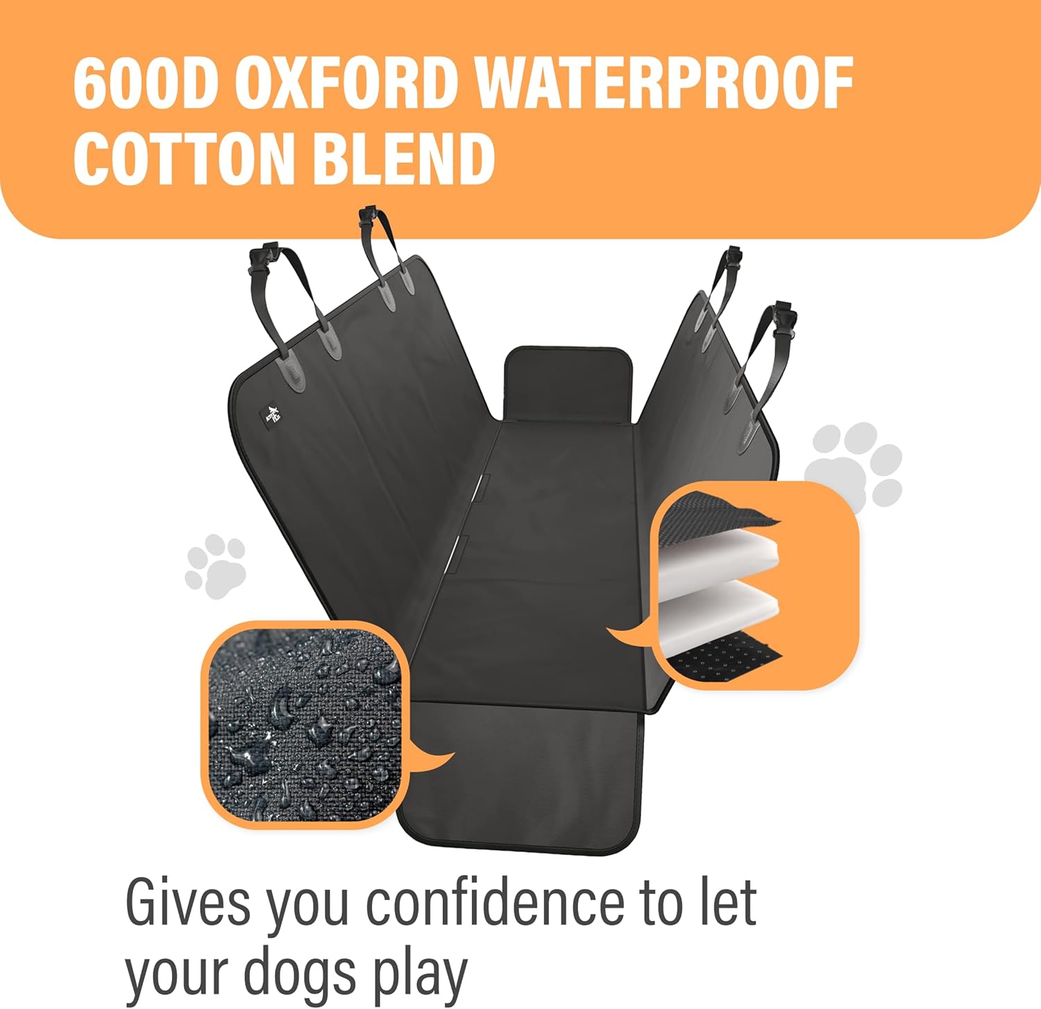 WATERPROOF PROTECTION FOR BACKSEAT: Advanced 600D Oxford waterproof dog car seat cover creates impenetrable barrier against accidents, protecting your car seats from pet messes while traveling with dogs in SUV, truck or sedan.