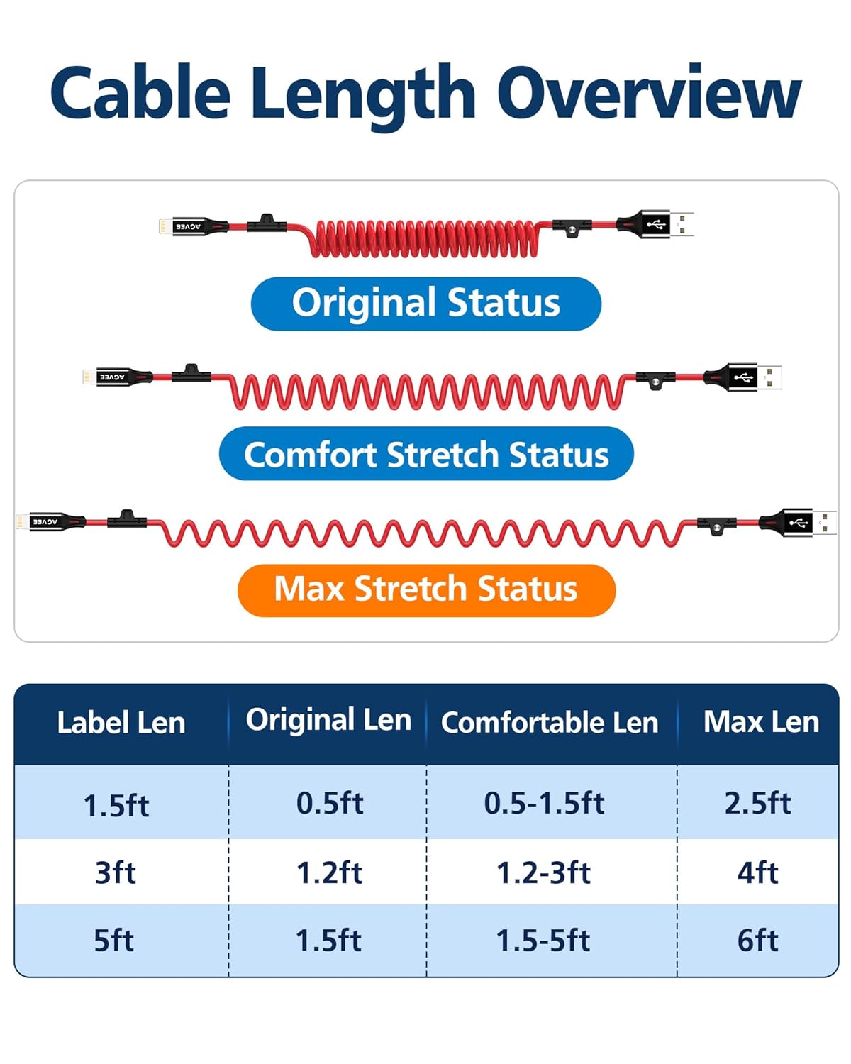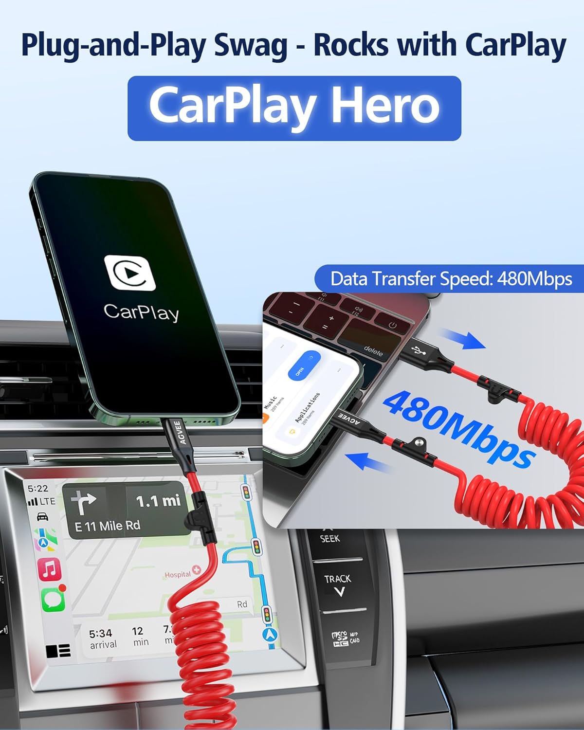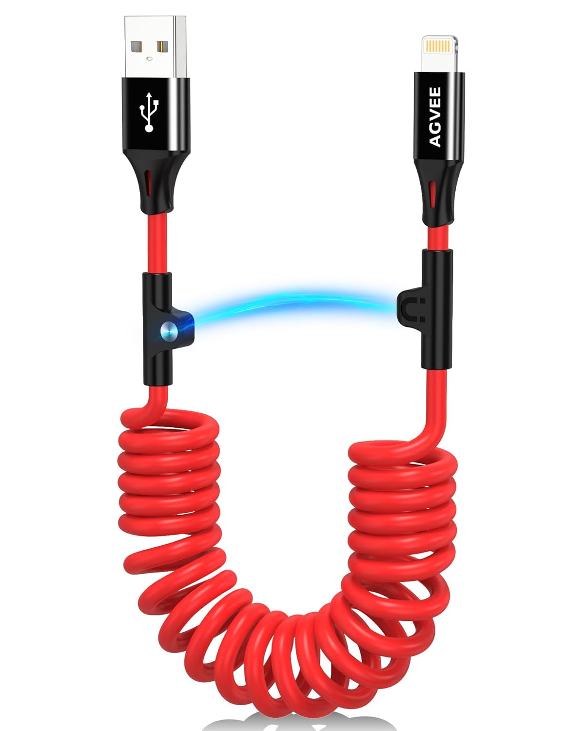 ⭕AGVEE Coiled USB-A to Lightning Cable: MFi-Certified, Lightning-Fast Charging & Tangle-Free Design for Car & Home Use
