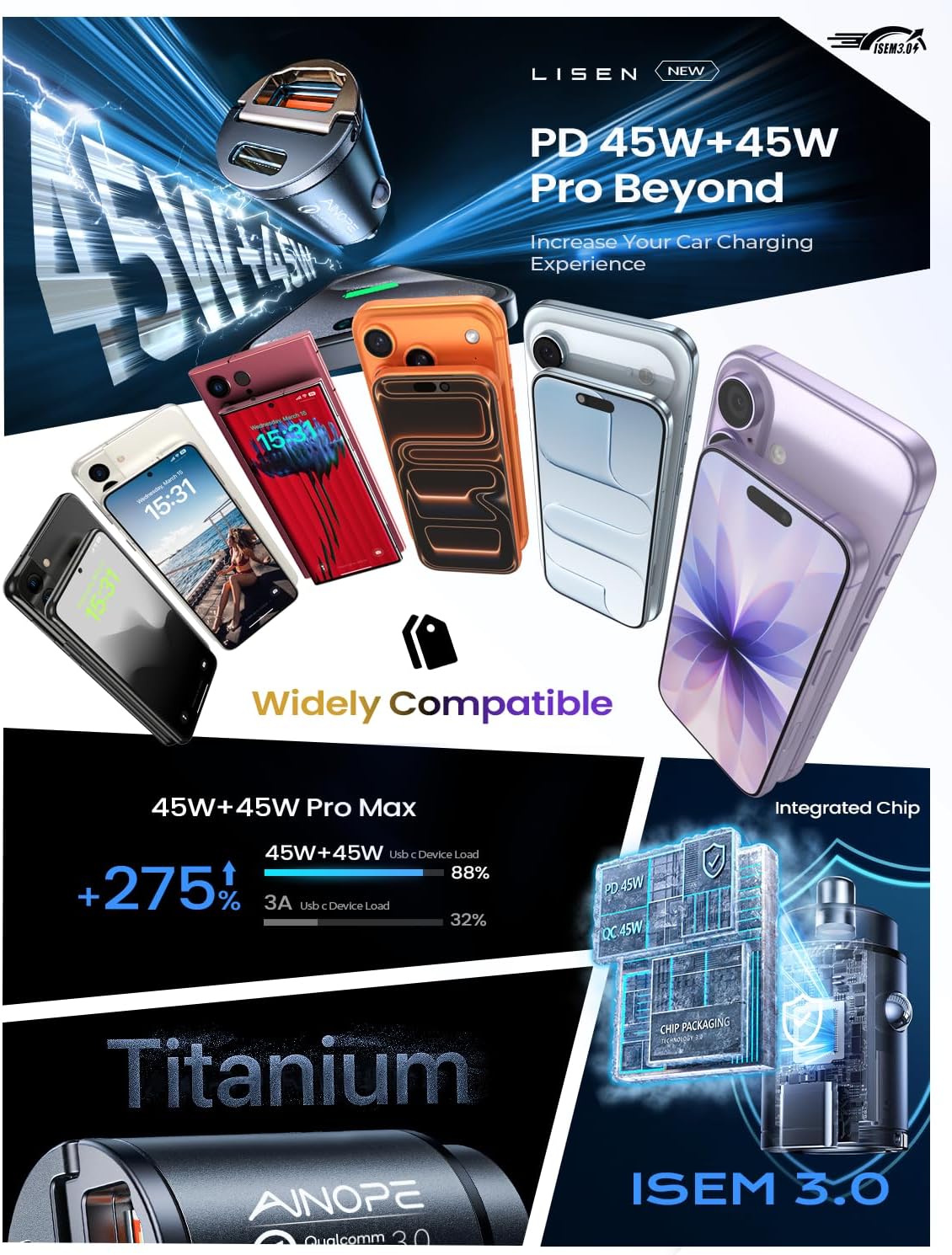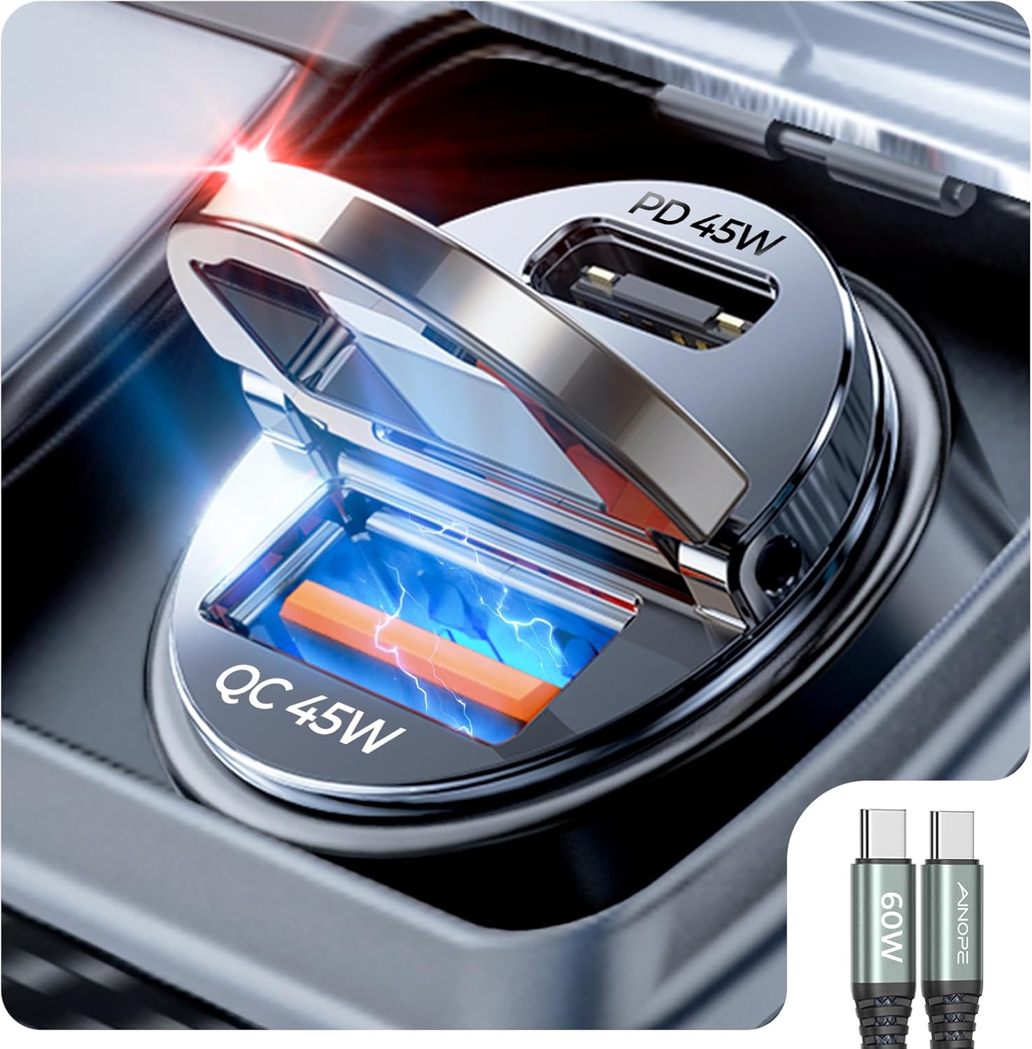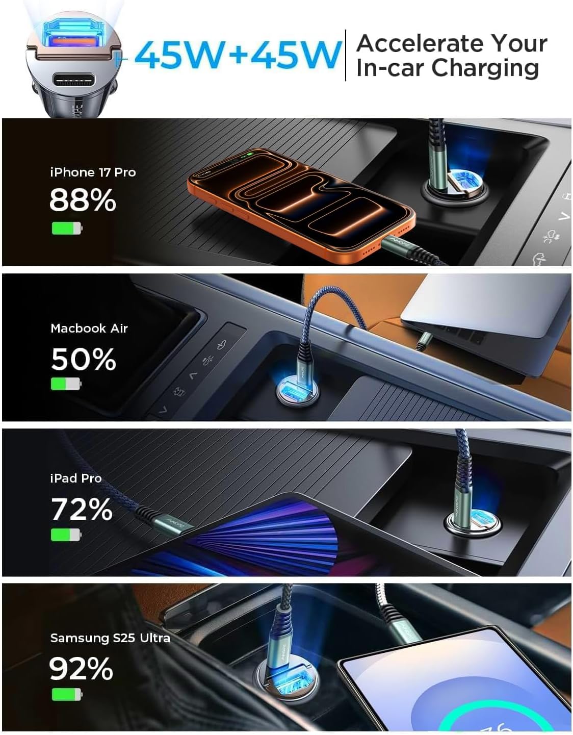 QC45W+PD45W Super Fast Charger: AINOPE USB C fast car charger which has dual ports PD 3.0 (45W) & QC 3.0 (45W) to optimize charging speed. Maximize the charging speed of your device.This samsung galaxy s25 ultra car charger makes the Samsung Galaxy S24 Ultra charging time from 0% to 92% in 30 minutes.This car fast charger usb c for iPhone 15 16 has been recognized by official USB-IF and Qualcomm and passes over 16 tests, allowing you to power your devices confidently.