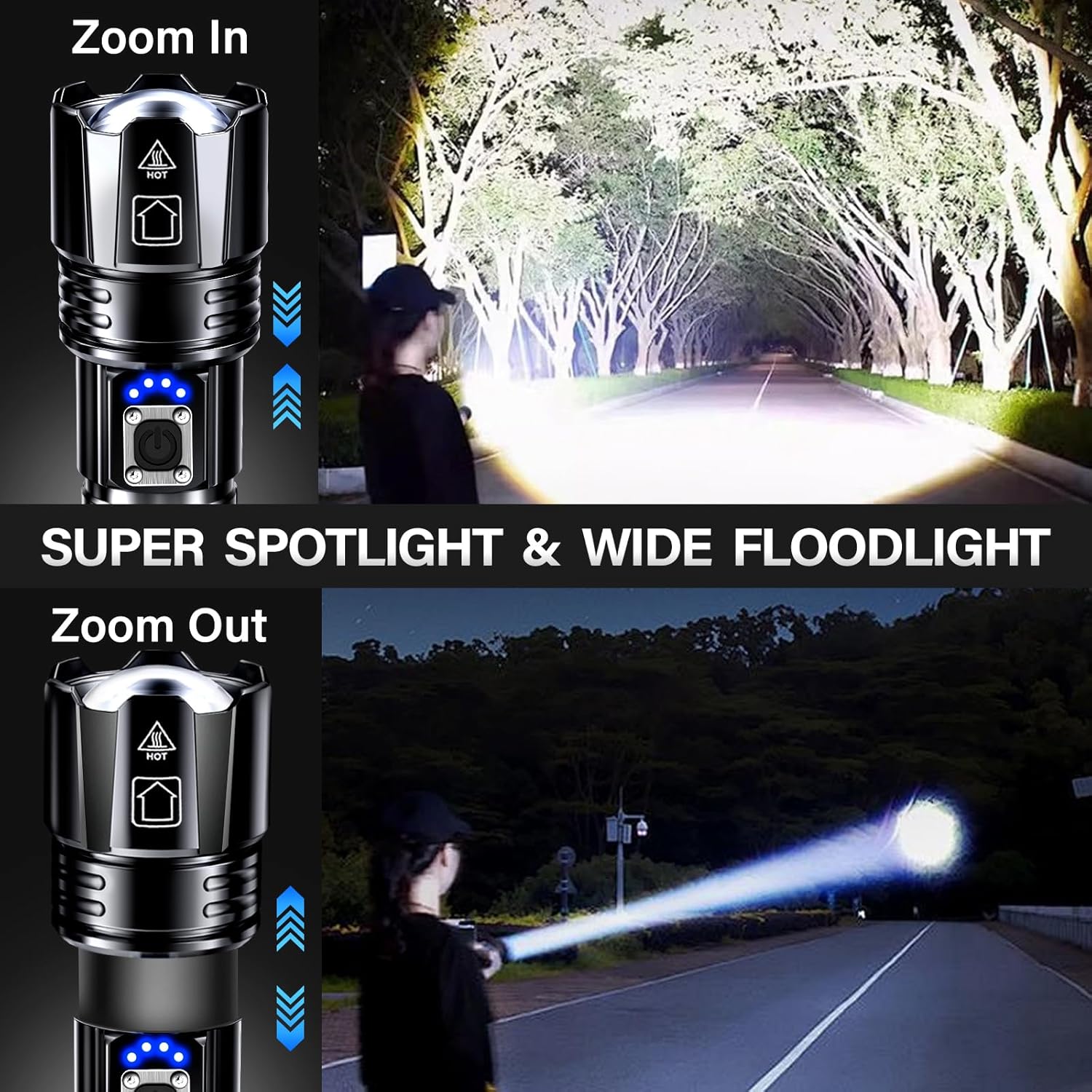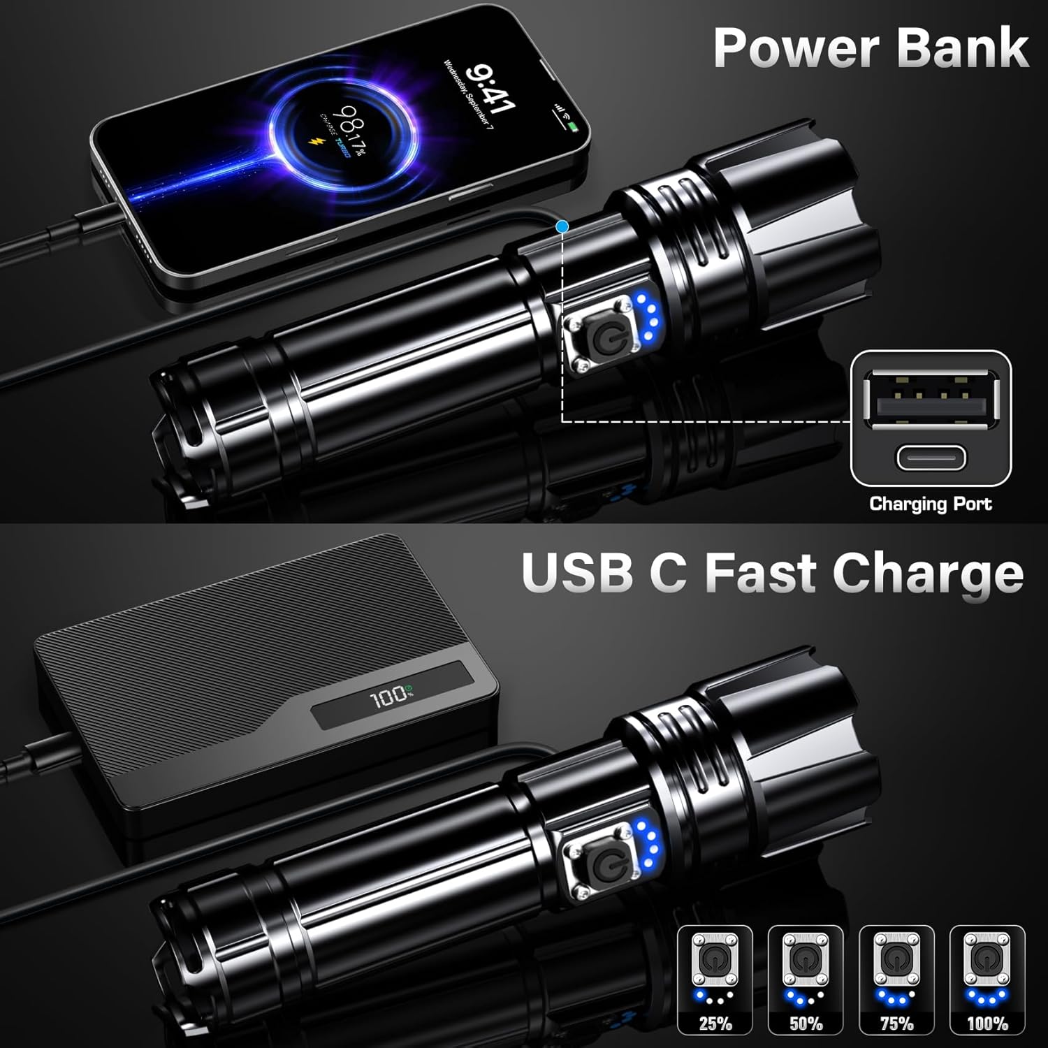 𝐔𝐒𝐁 𝐂 𝐅𝐚𝐬𝐭 𝐂𝐡𝐚𝐫𝐠𝐢𝐧𝐠 & 𝐏𝐨𝐰𝐞𝐫 𝐃𝐢𝐬𝐩𝐥𝐚𝐲: Rechargeable flashlights built in type-c fast charge port, charging speed is double of ordinary micro-usb interface flashlight. LED flashlight designed a 25%/50%/75% 100% power display function, let you know the power status of the handheld flashlights in real time